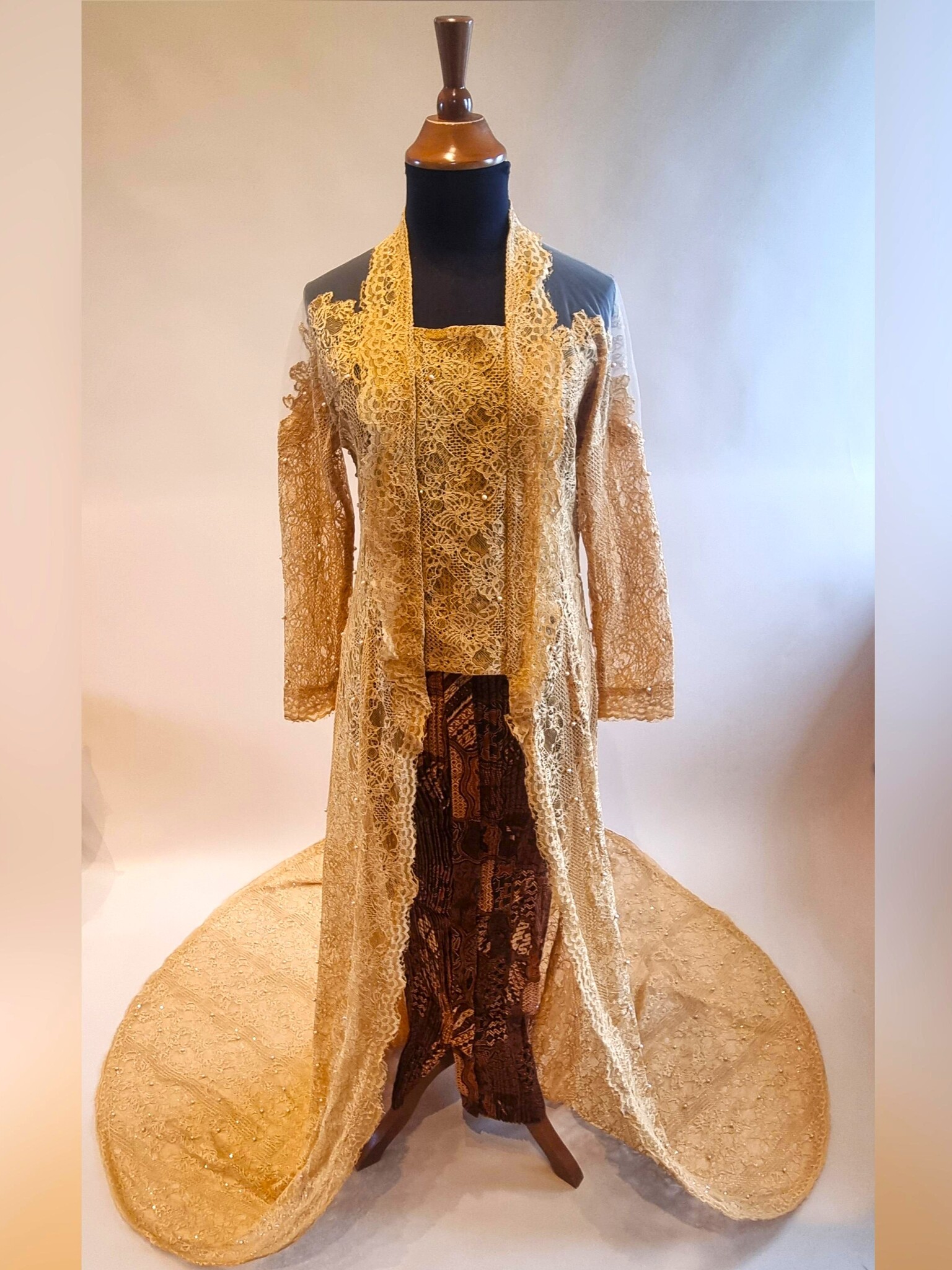De bruidskebaya is gemaakt van kanten stof (stretch) met een lange sleep, versierd met kleine pareltjes.