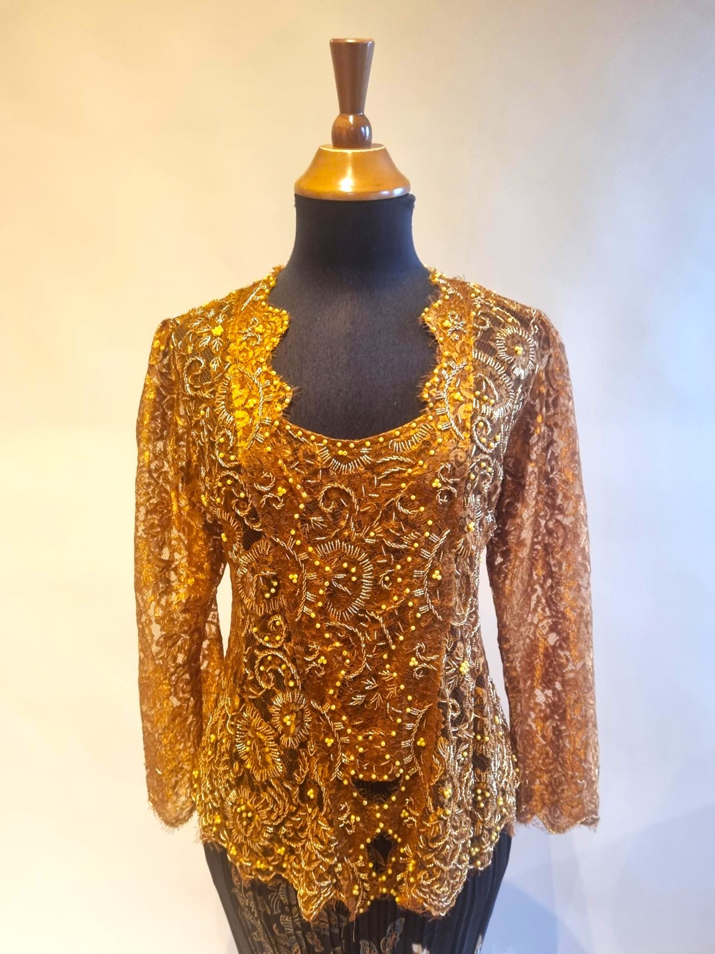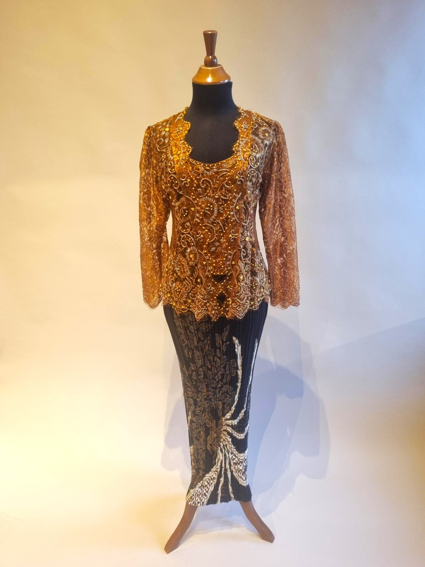De kebaya is gemaakt van kanten stof versierd met pailletten.