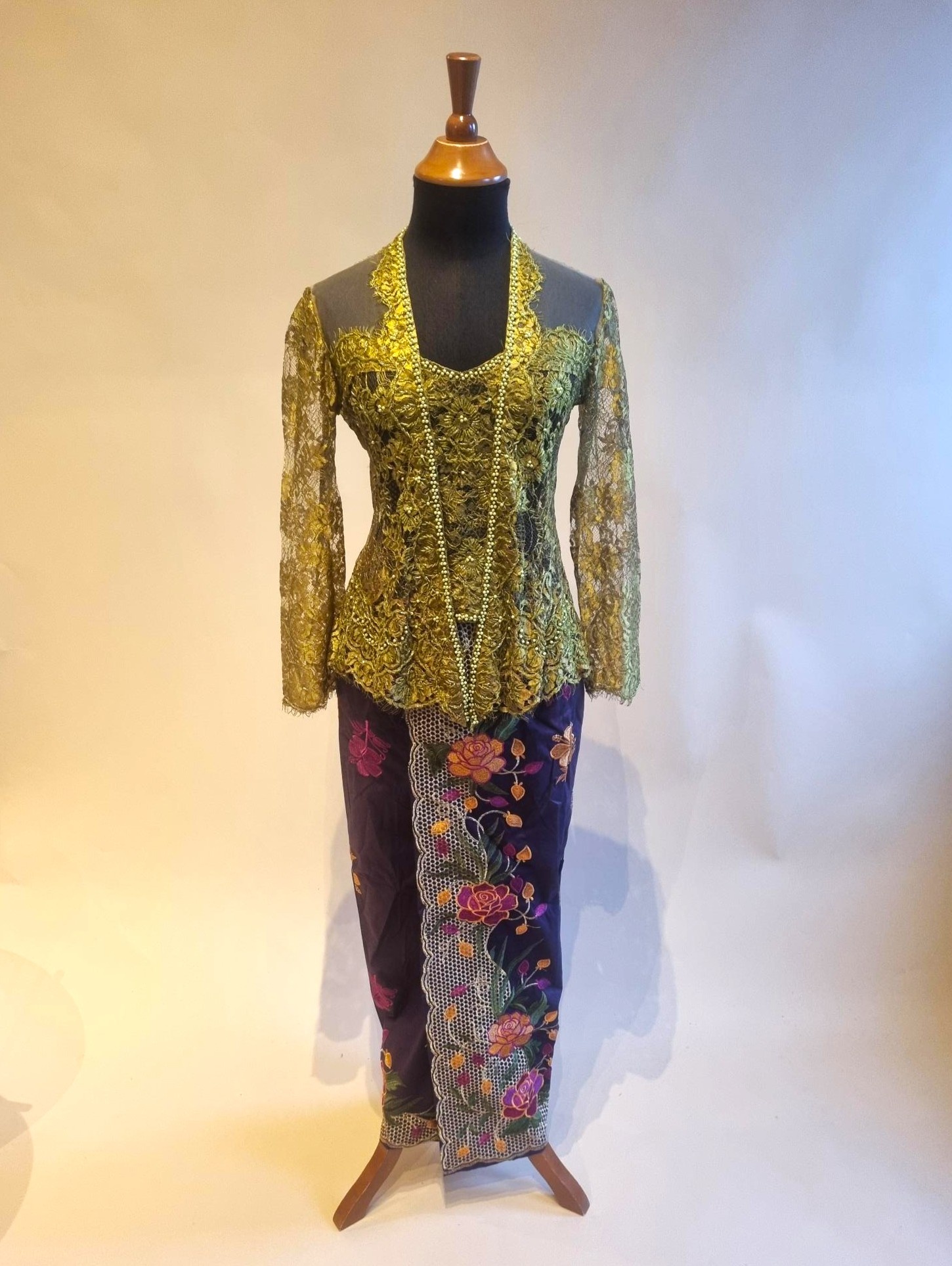 De kebaya is gemaakt van kanten stof i.c.m. tulle stof, versierd met pailletten.