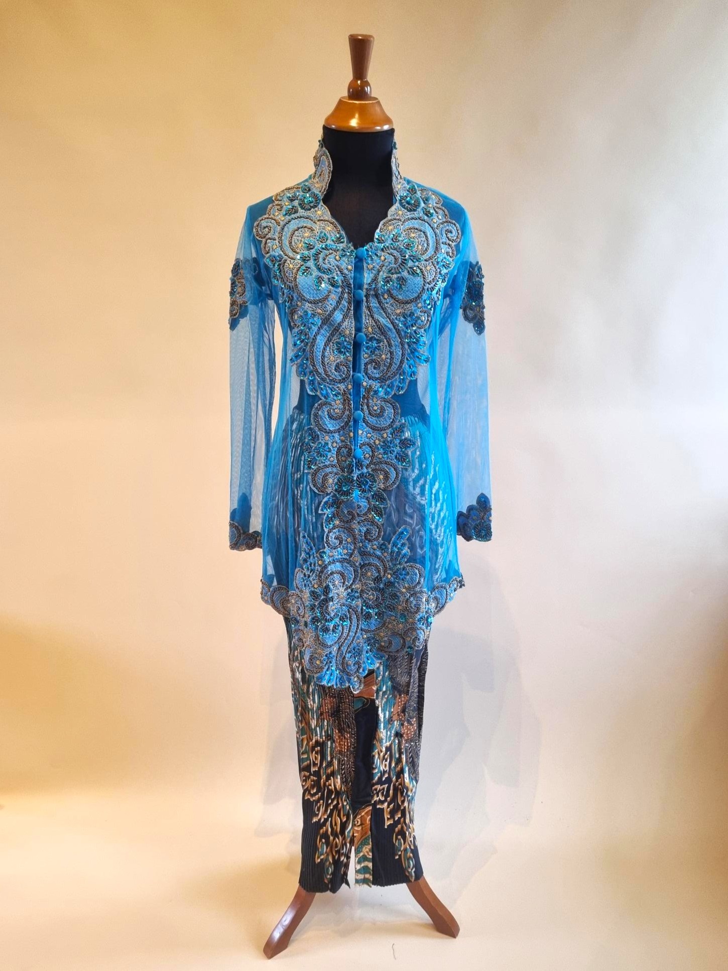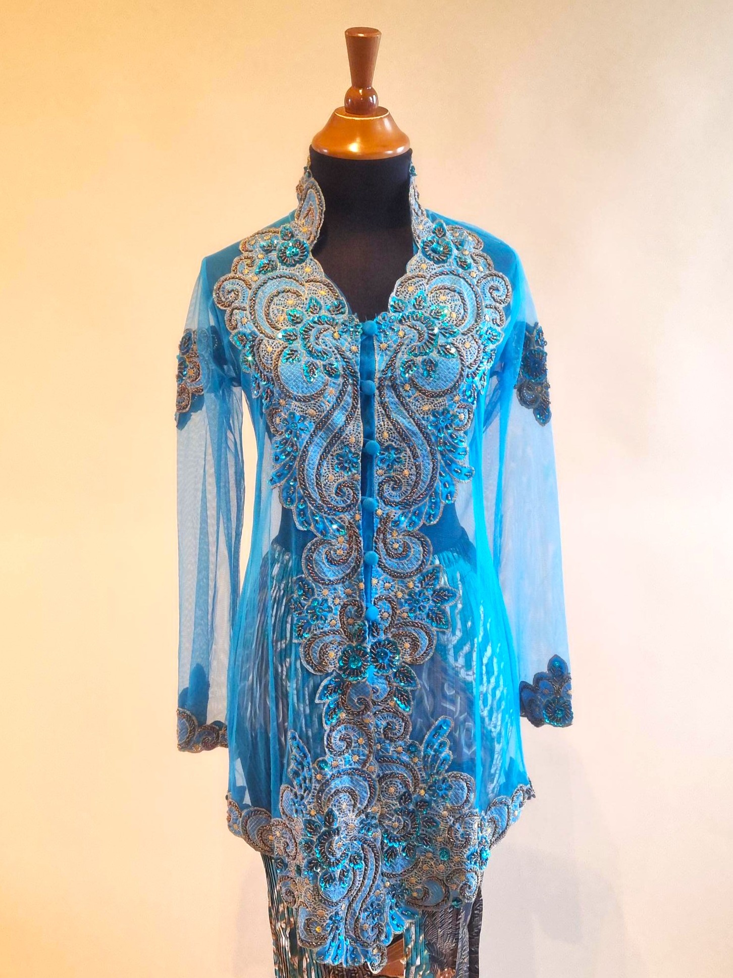 De kebaya is gemaakt van tulle rekbaar stof, versierd met pailletten.