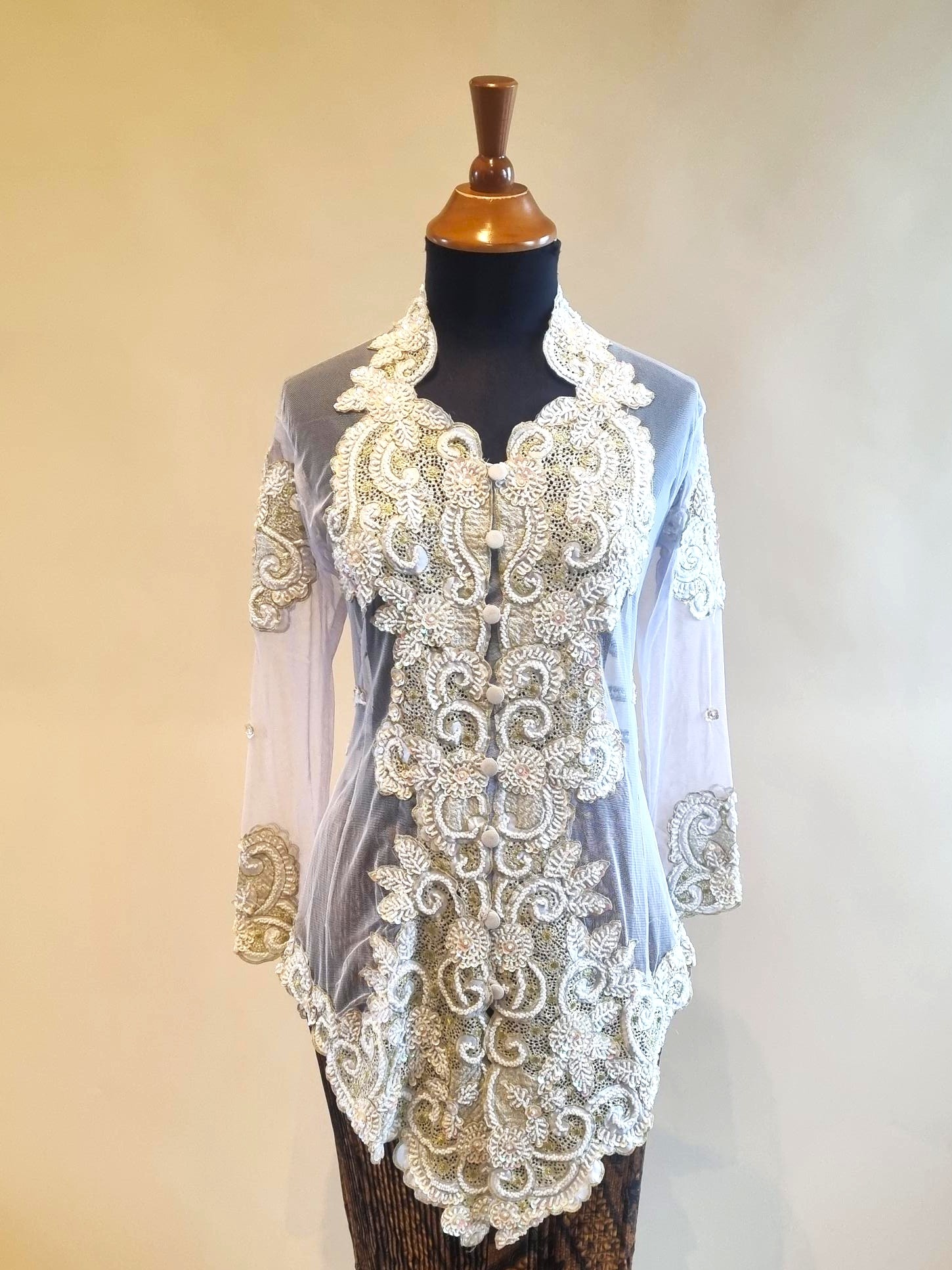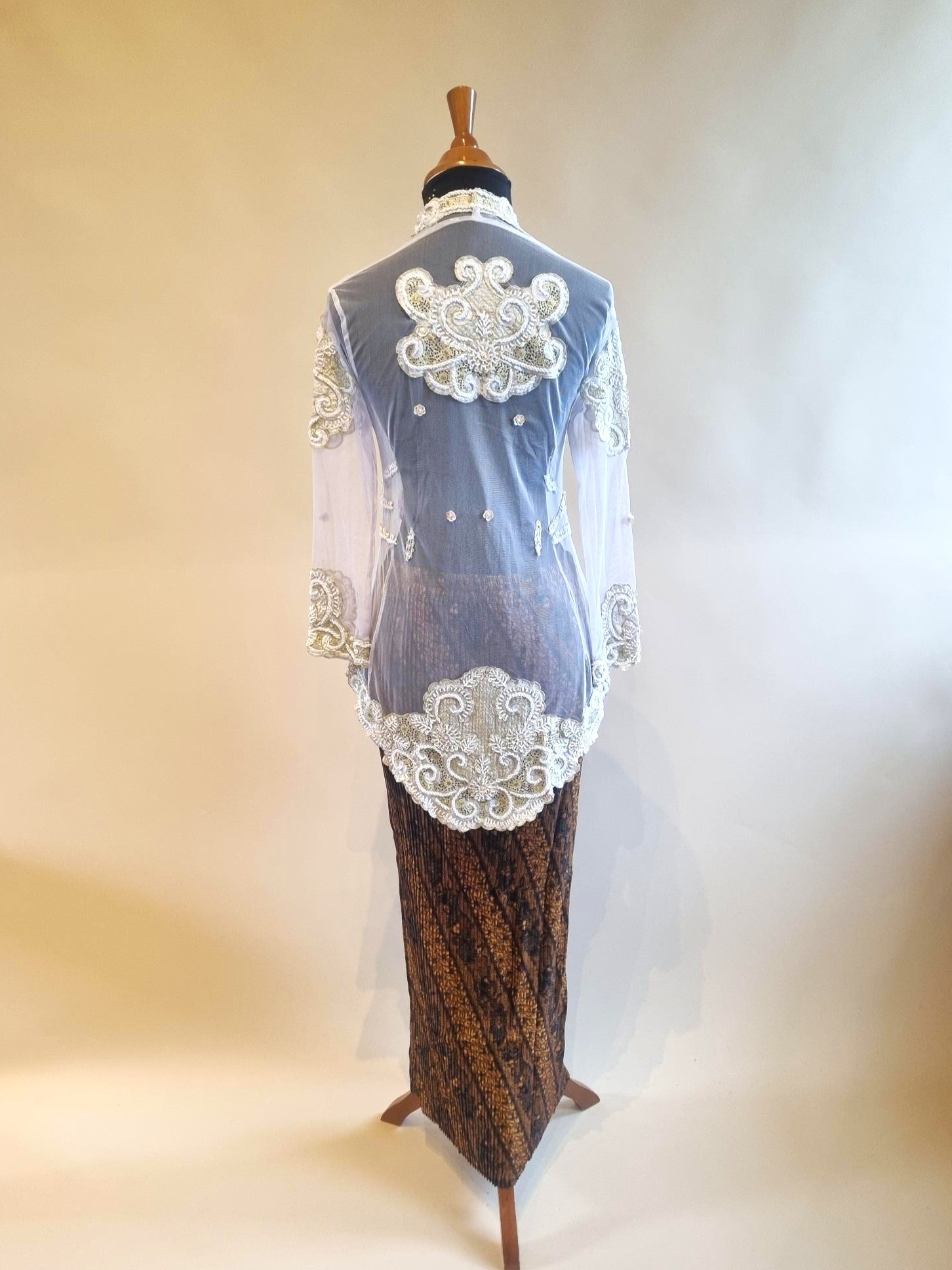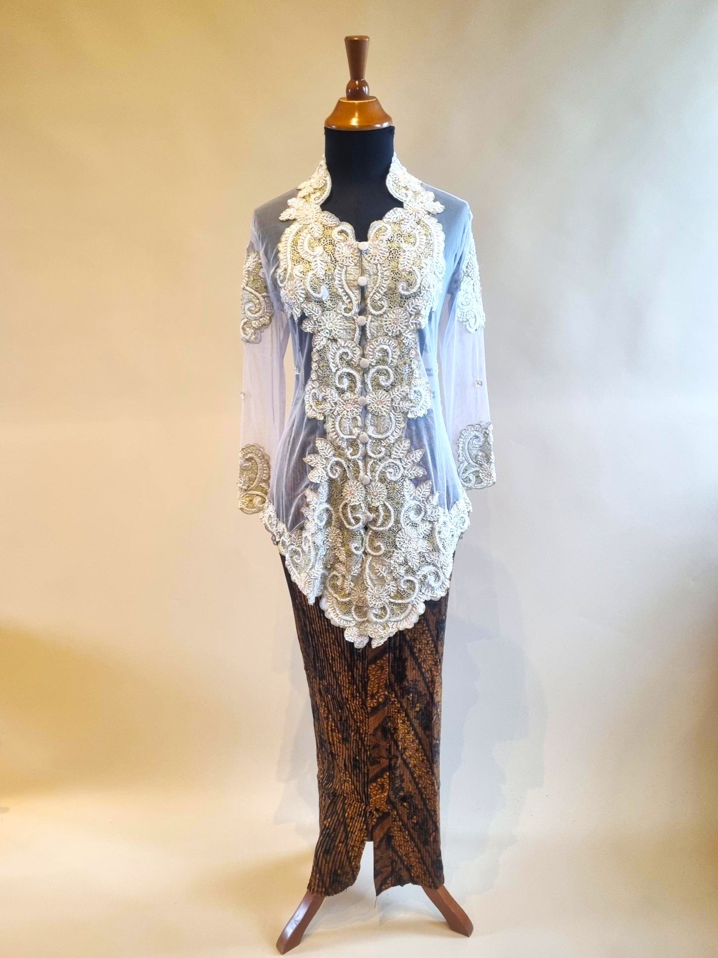 De kebaya is gemaakt van tulle rekbaar stof, versierd met pailletten.