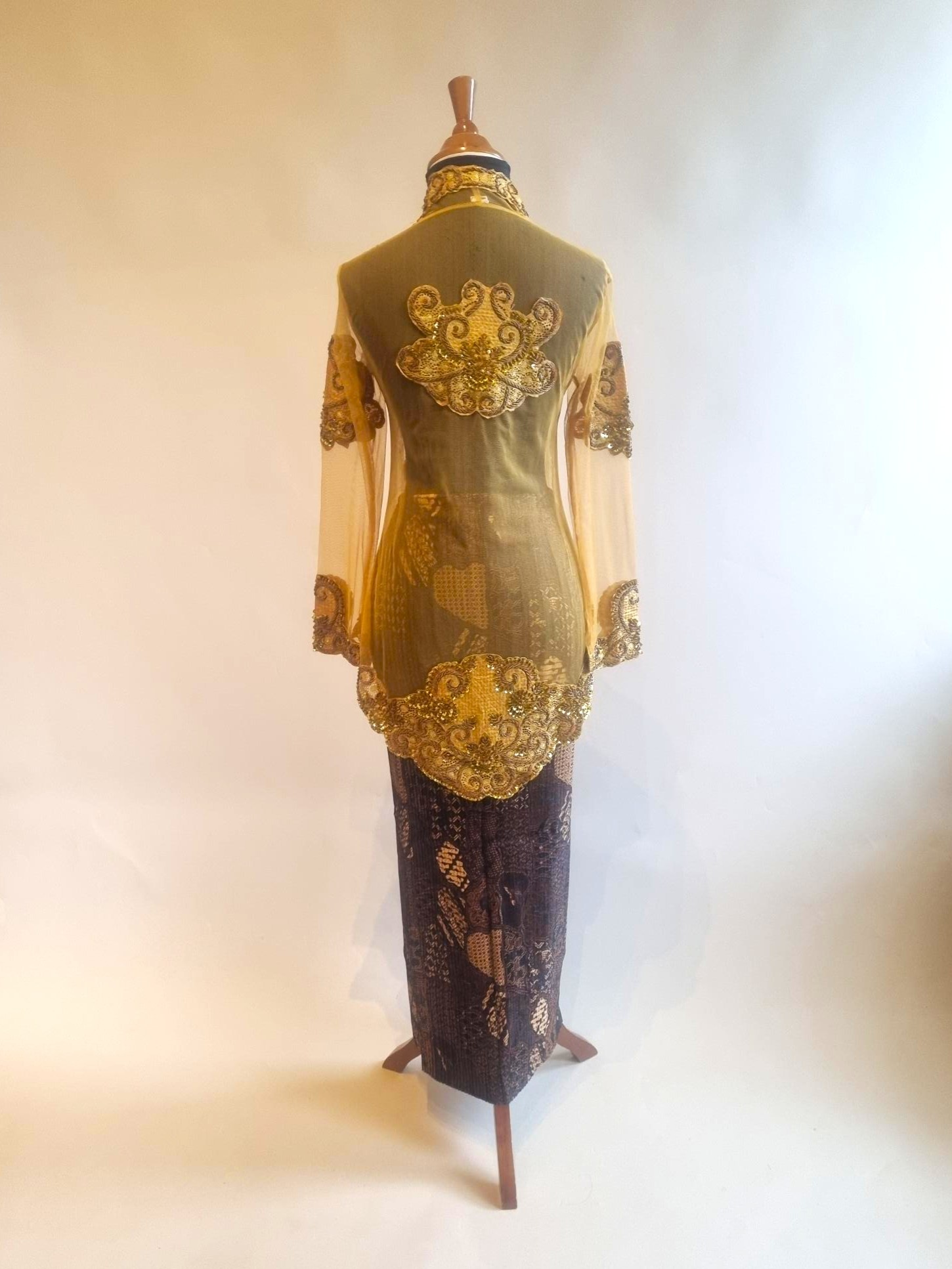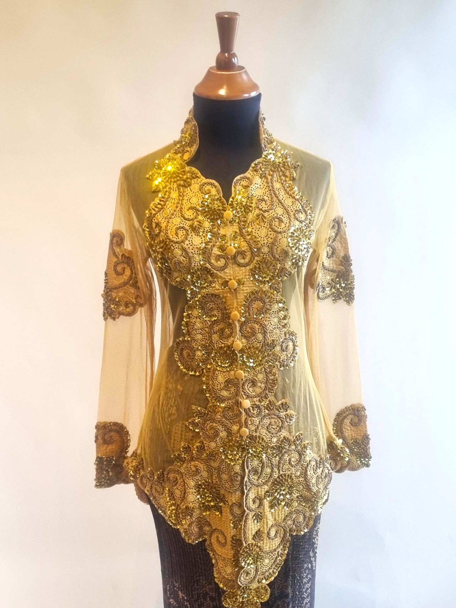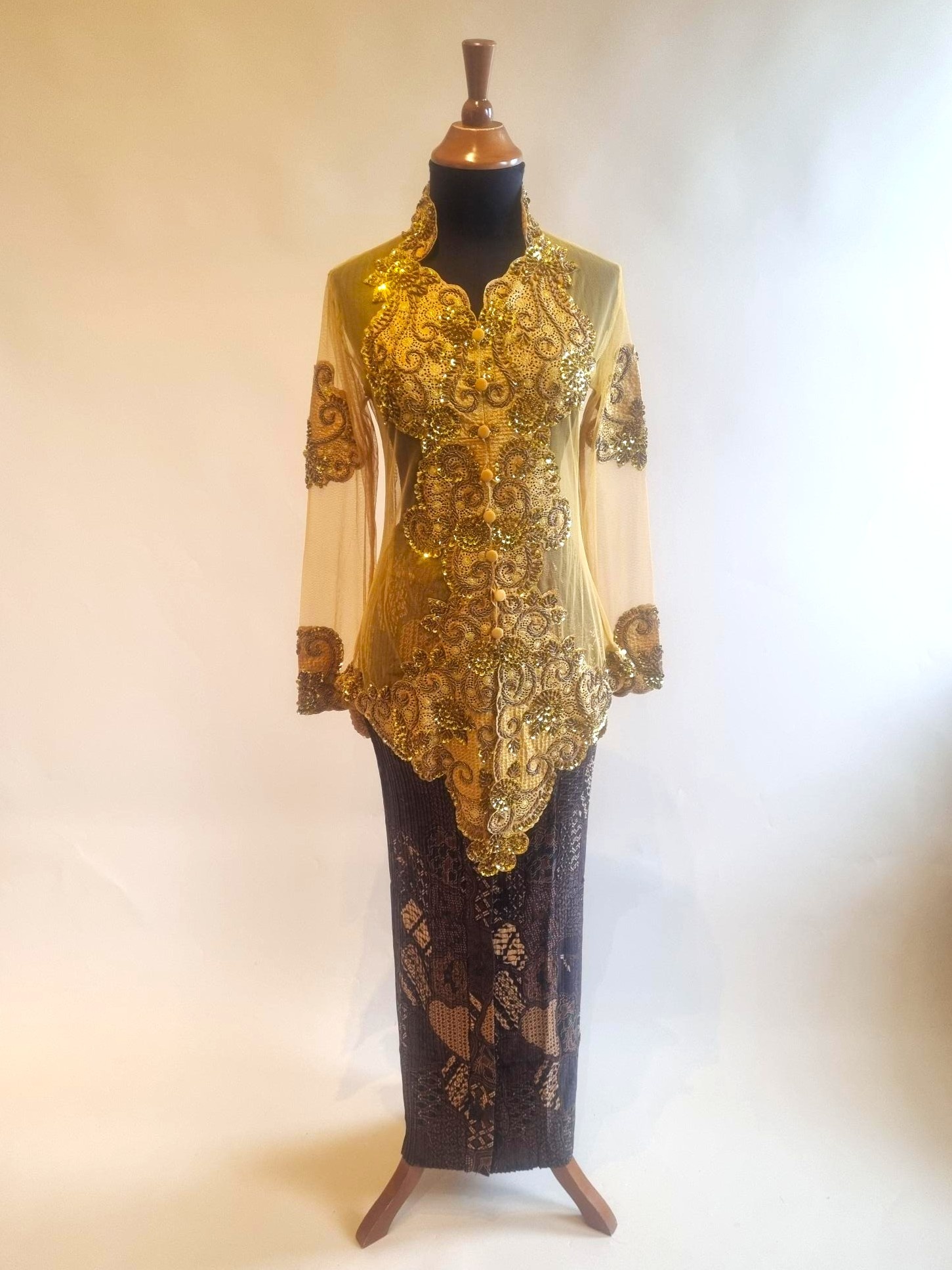 De kebaya is gemaakt van tulle rekbaar stof, versierd met pailletten.