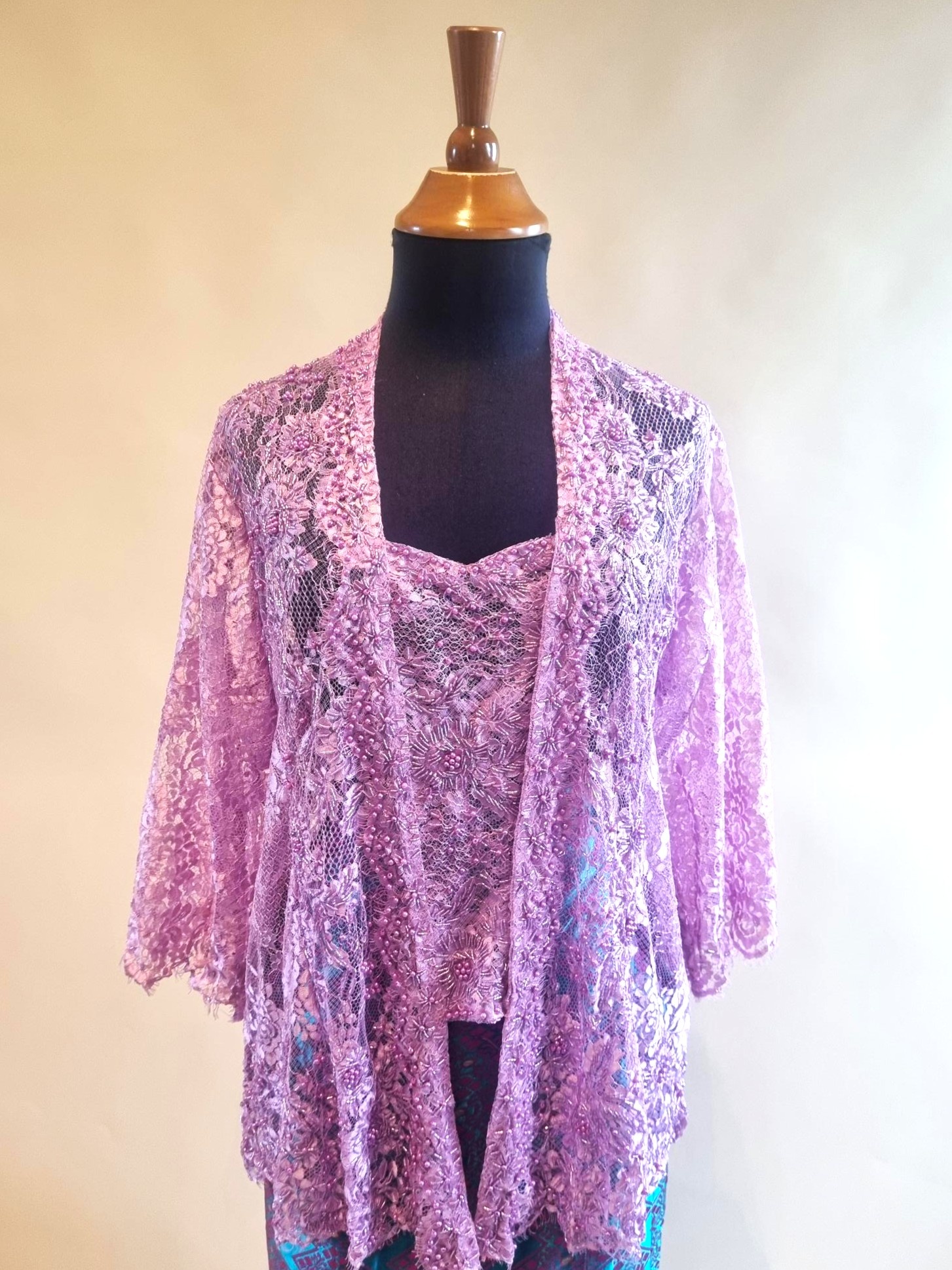 De kebaya is gemaakt van kanten stof (rekbaar) versierd met pailletten.