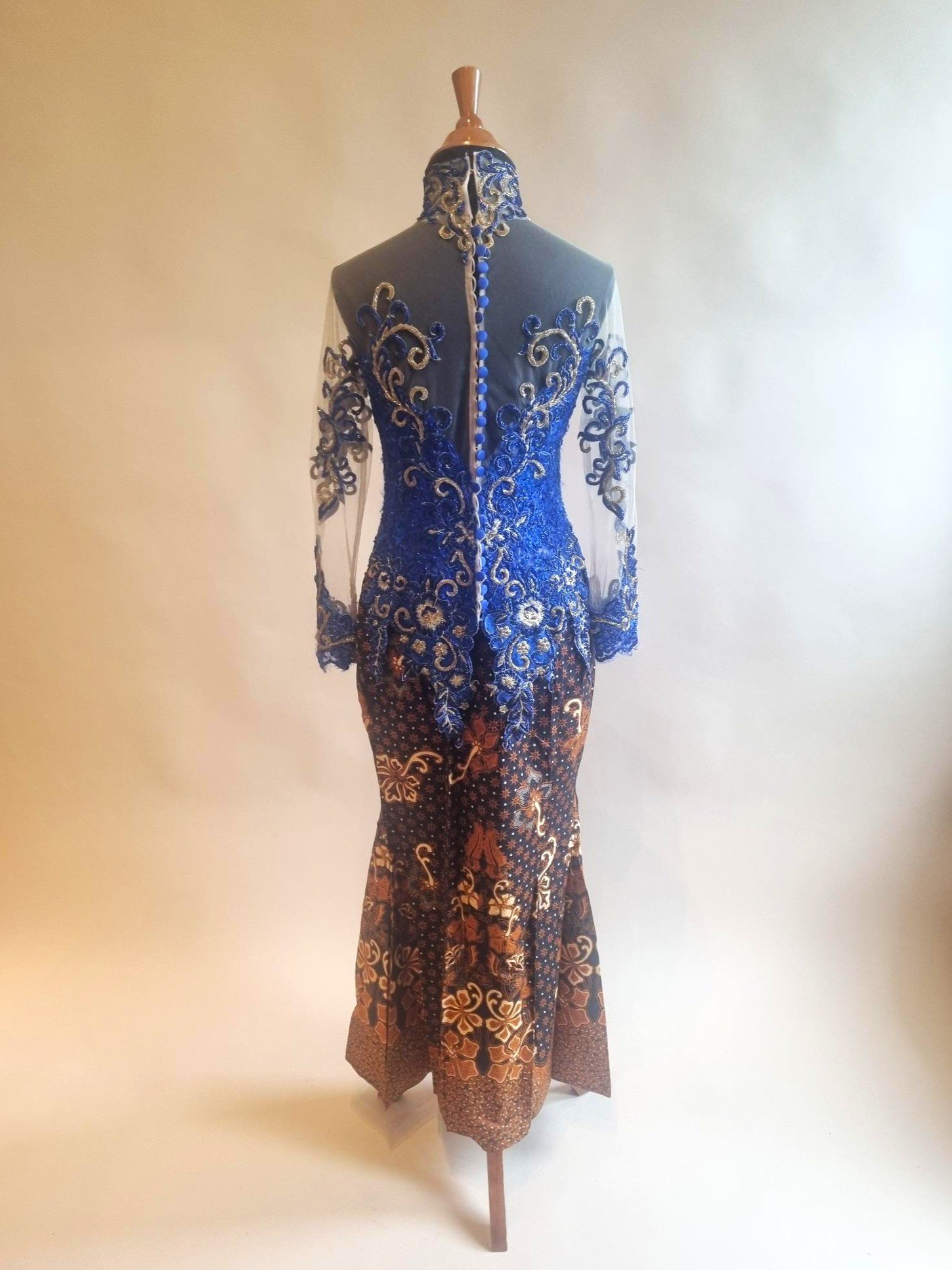 De kebaya is gemaakt van kanten stof i.c.m. tulle stof, versierd met veel pailletten.
