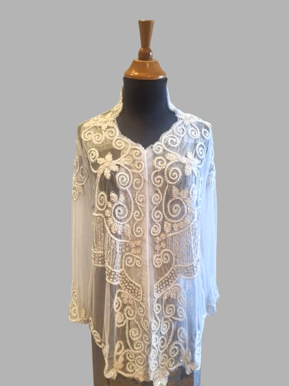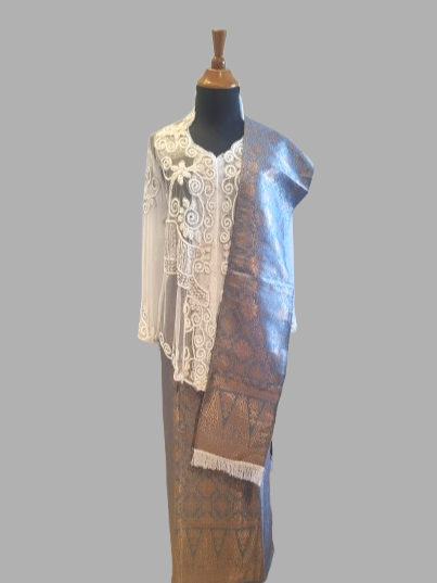 De kebaya is gemaakt van tulle rekbaar stof, versierd met pailletten.