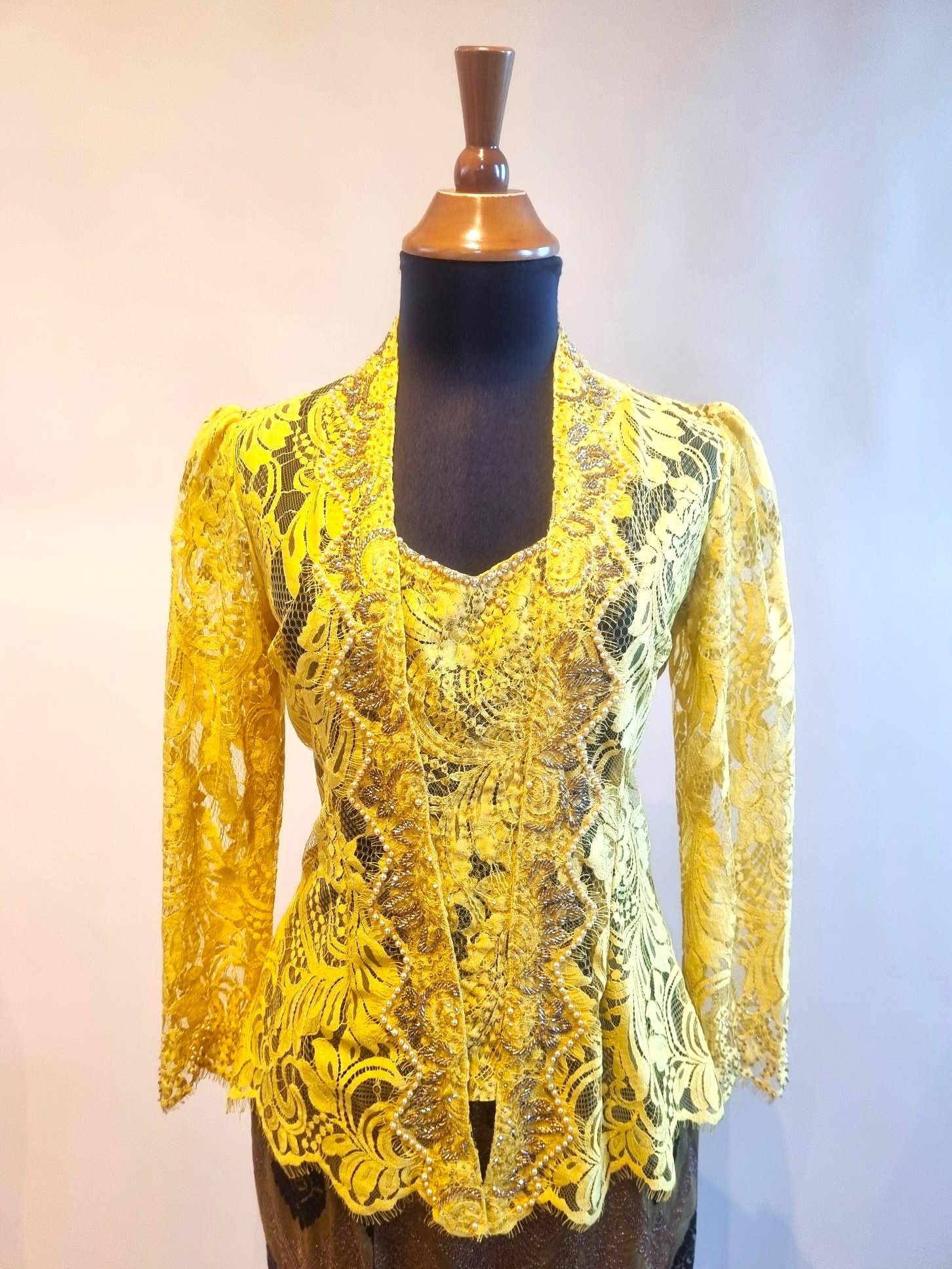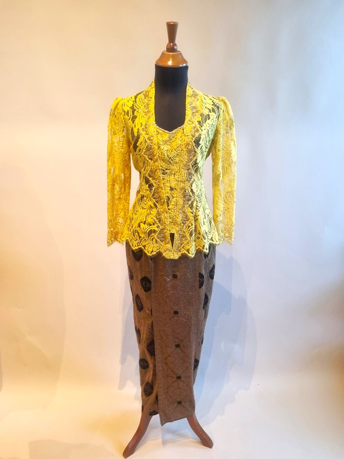 De kebaya is gemaakt van kanten stof versierd met pailletten.