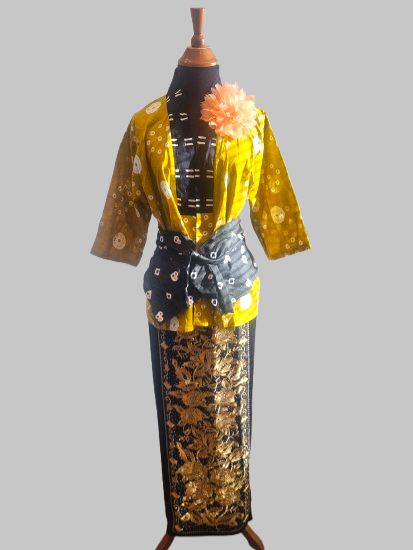 De kebaya heeft kimono stijl, motief jumputan, een open stijl met bijpassende brede riem.
