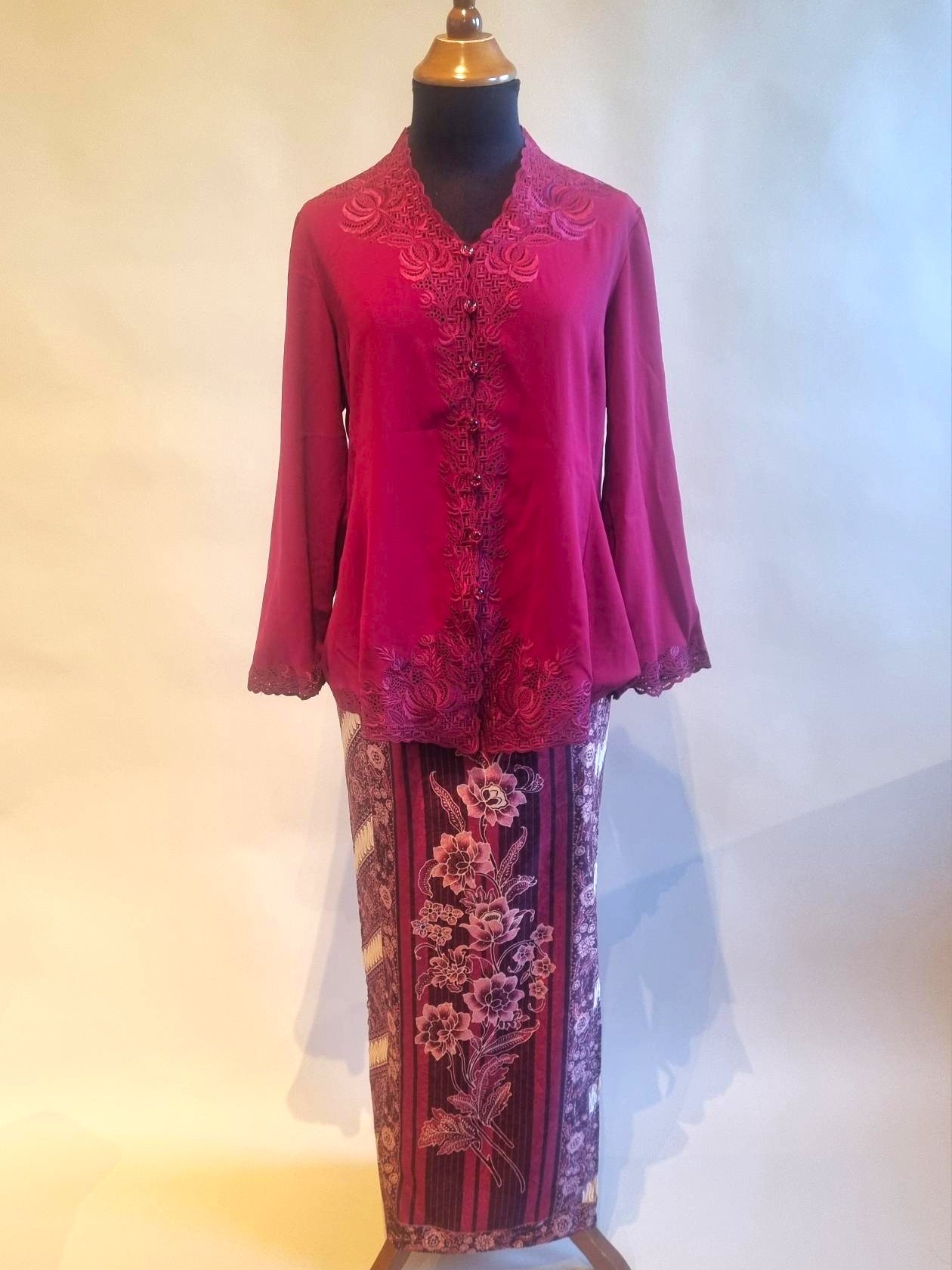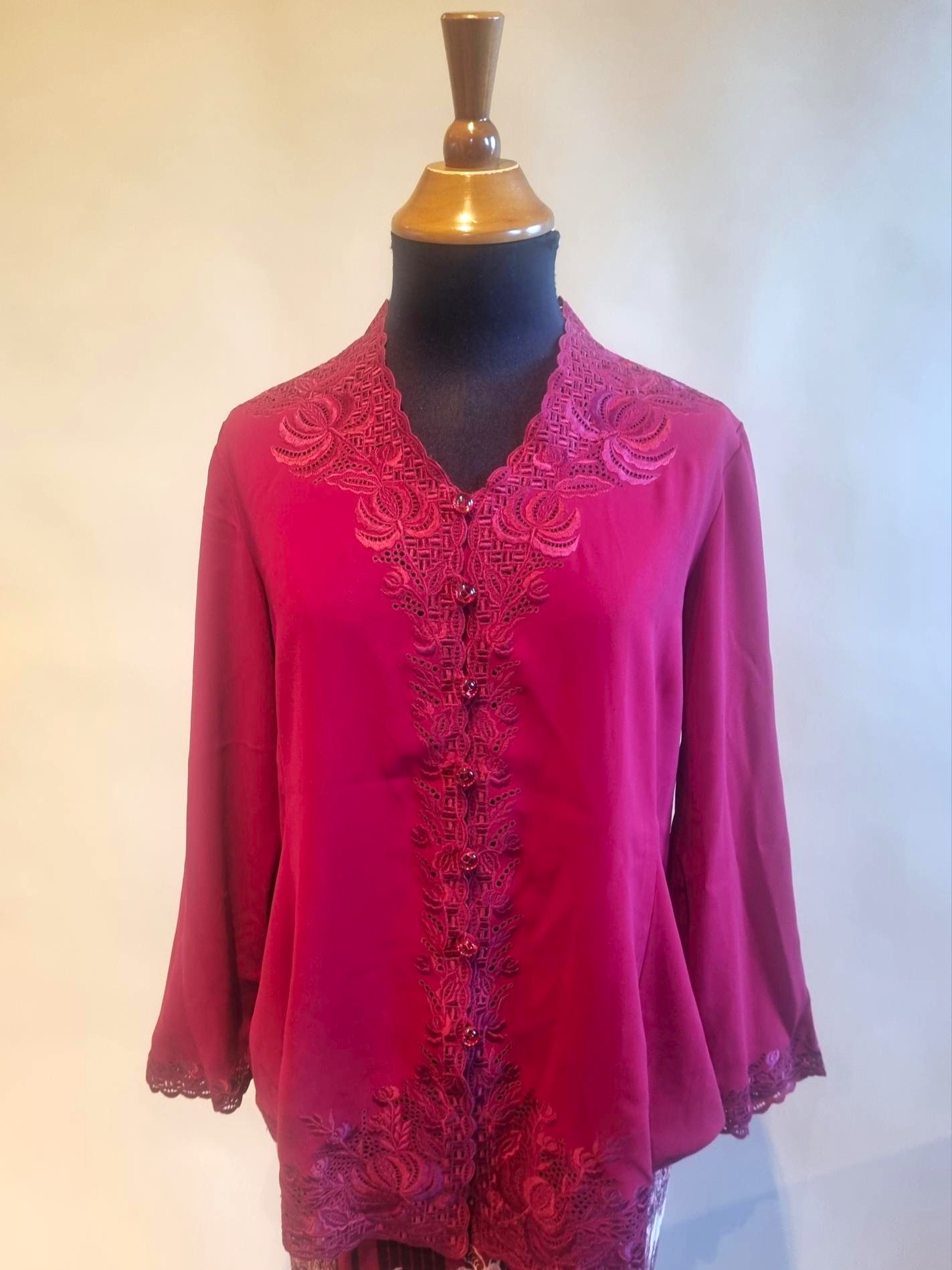 De kebaya is gemaakt van polyester stof versierd met borduurwerk.