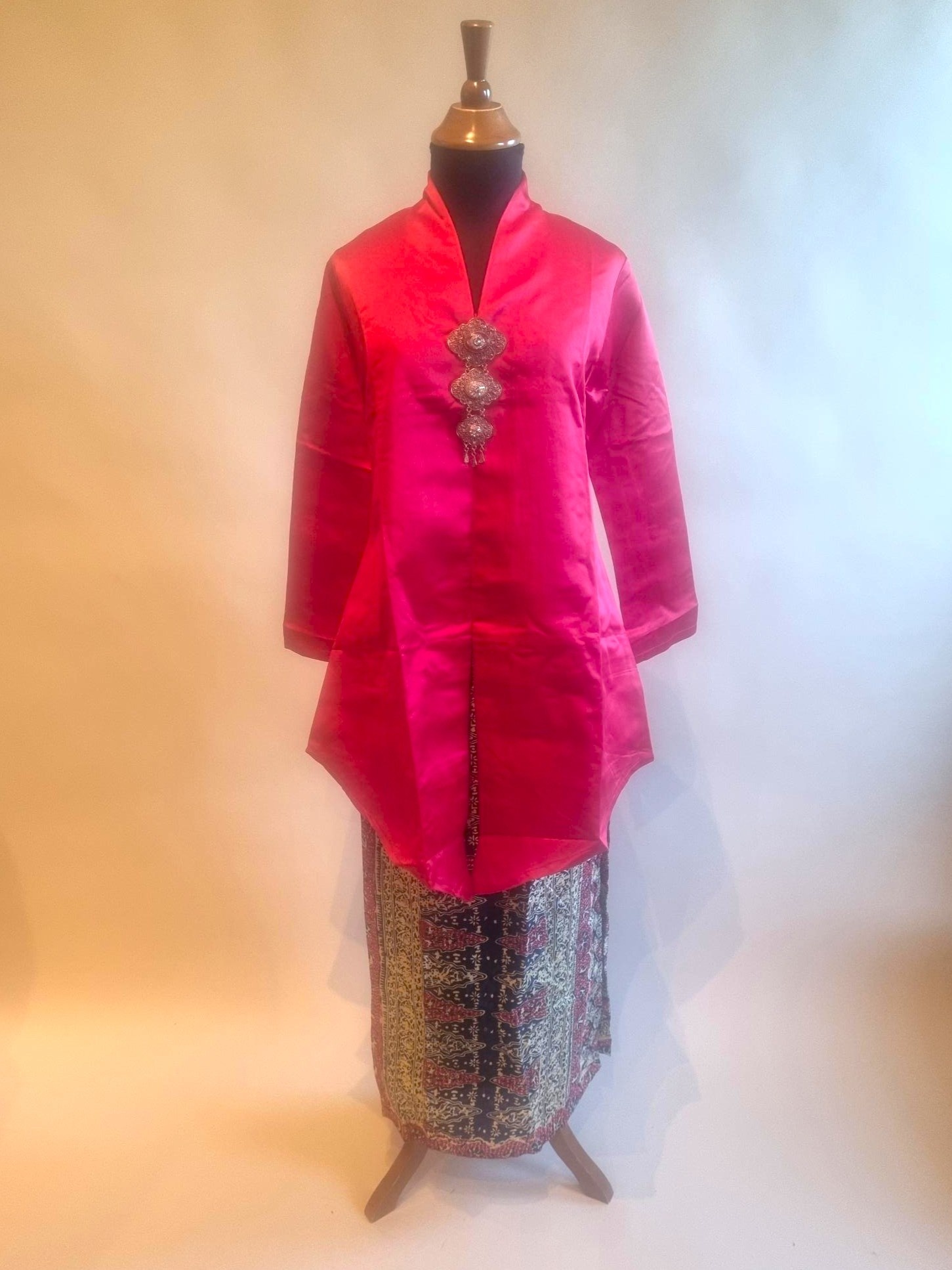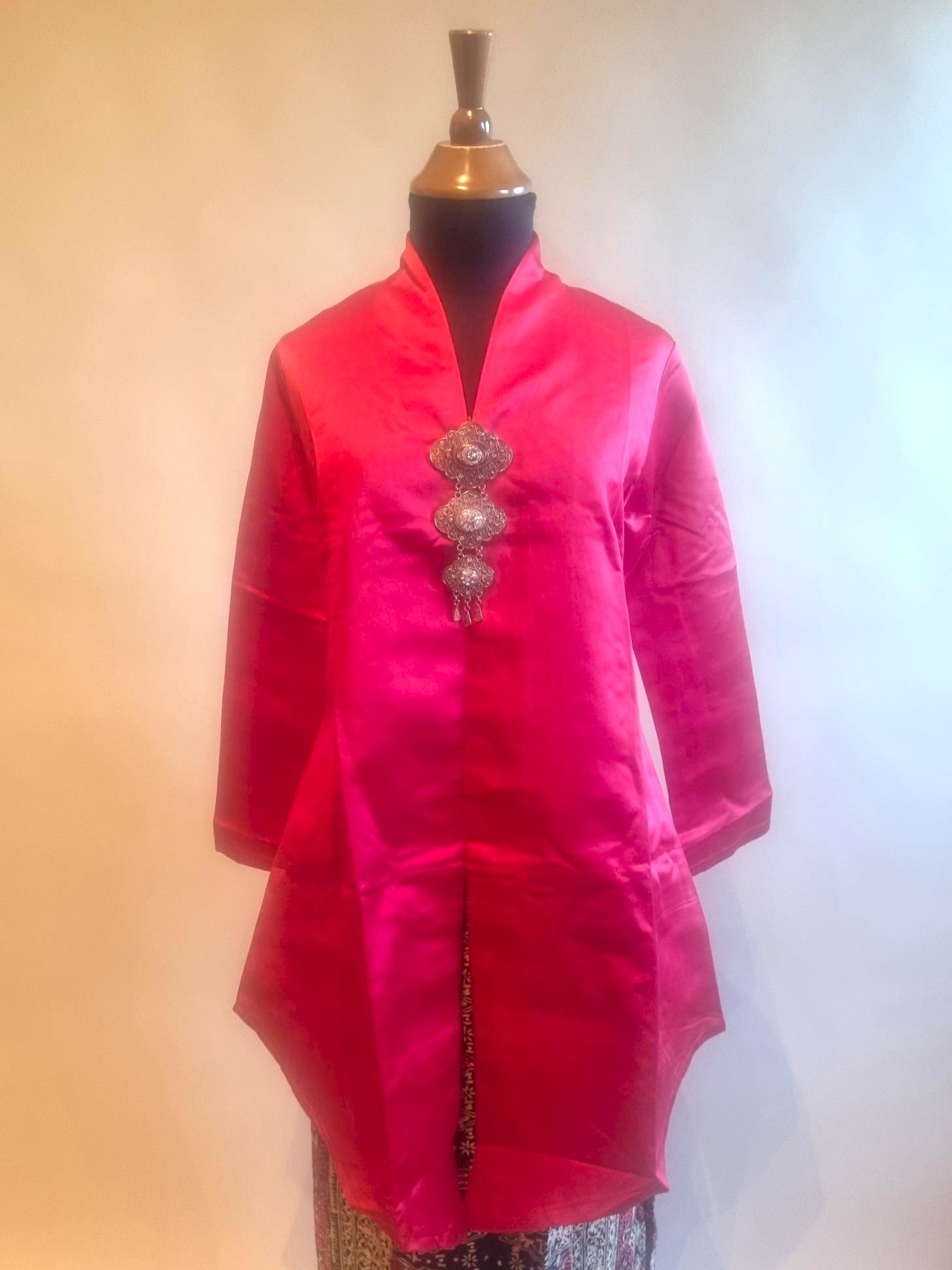 De kebaya is gemaakt van polyester satijn stof.