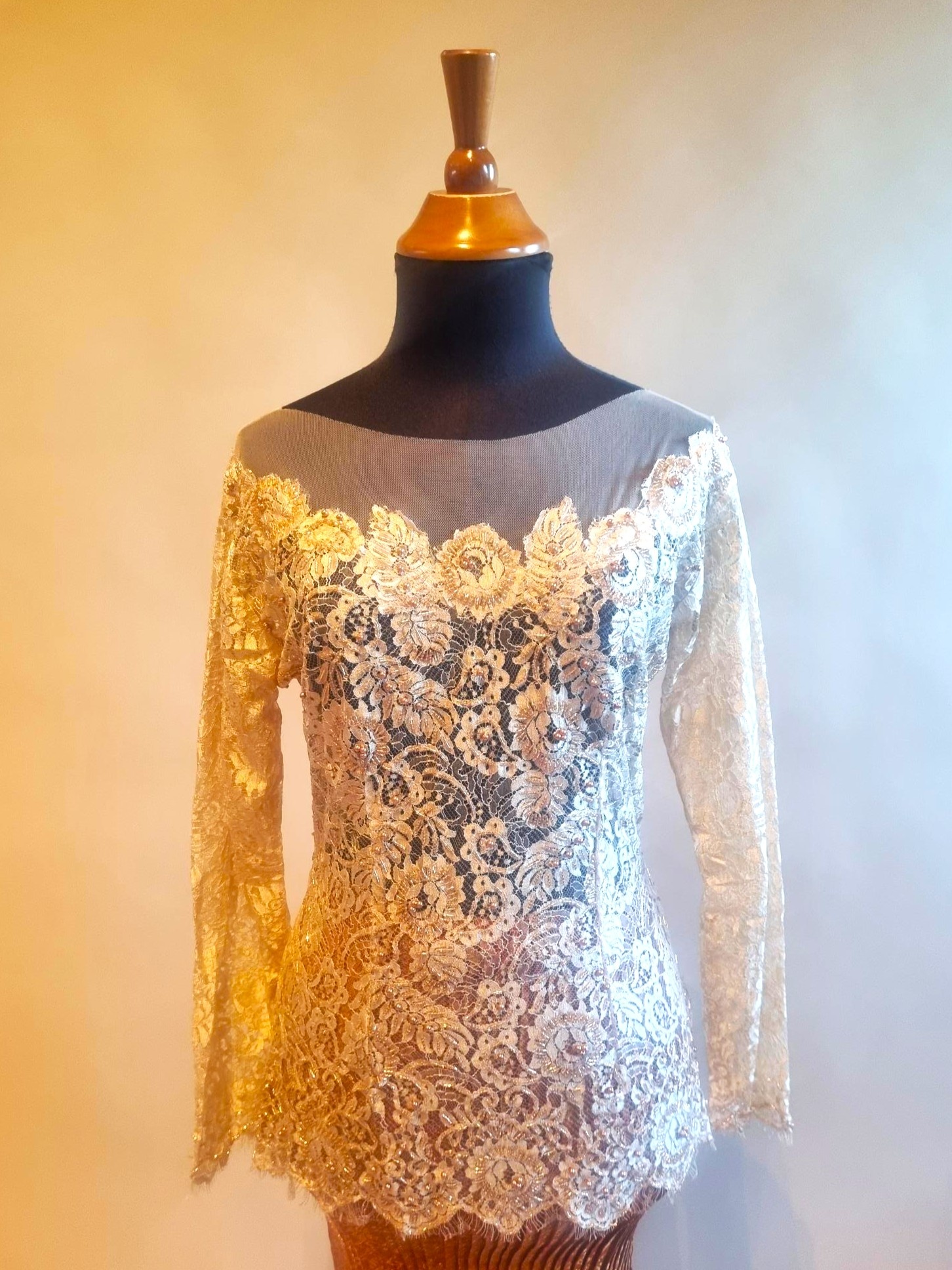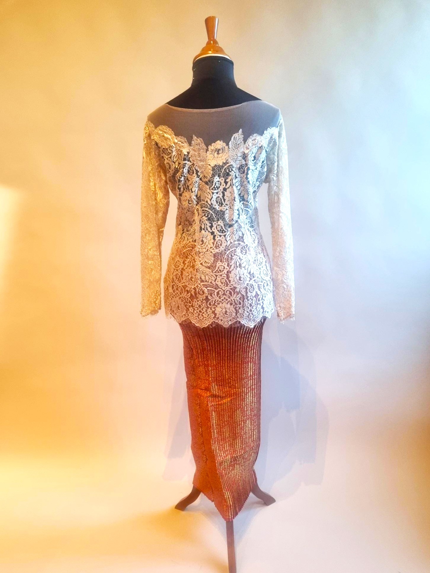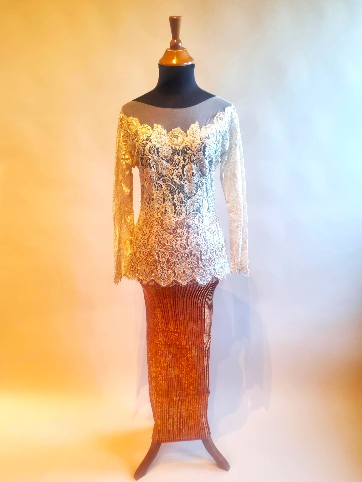 De kebaya is gemaakt van kanten stof i.c.m. tulle stof.