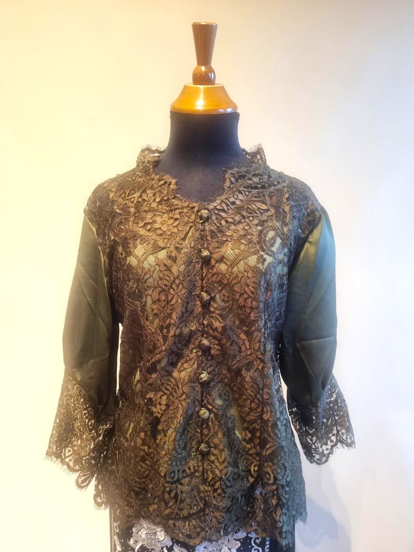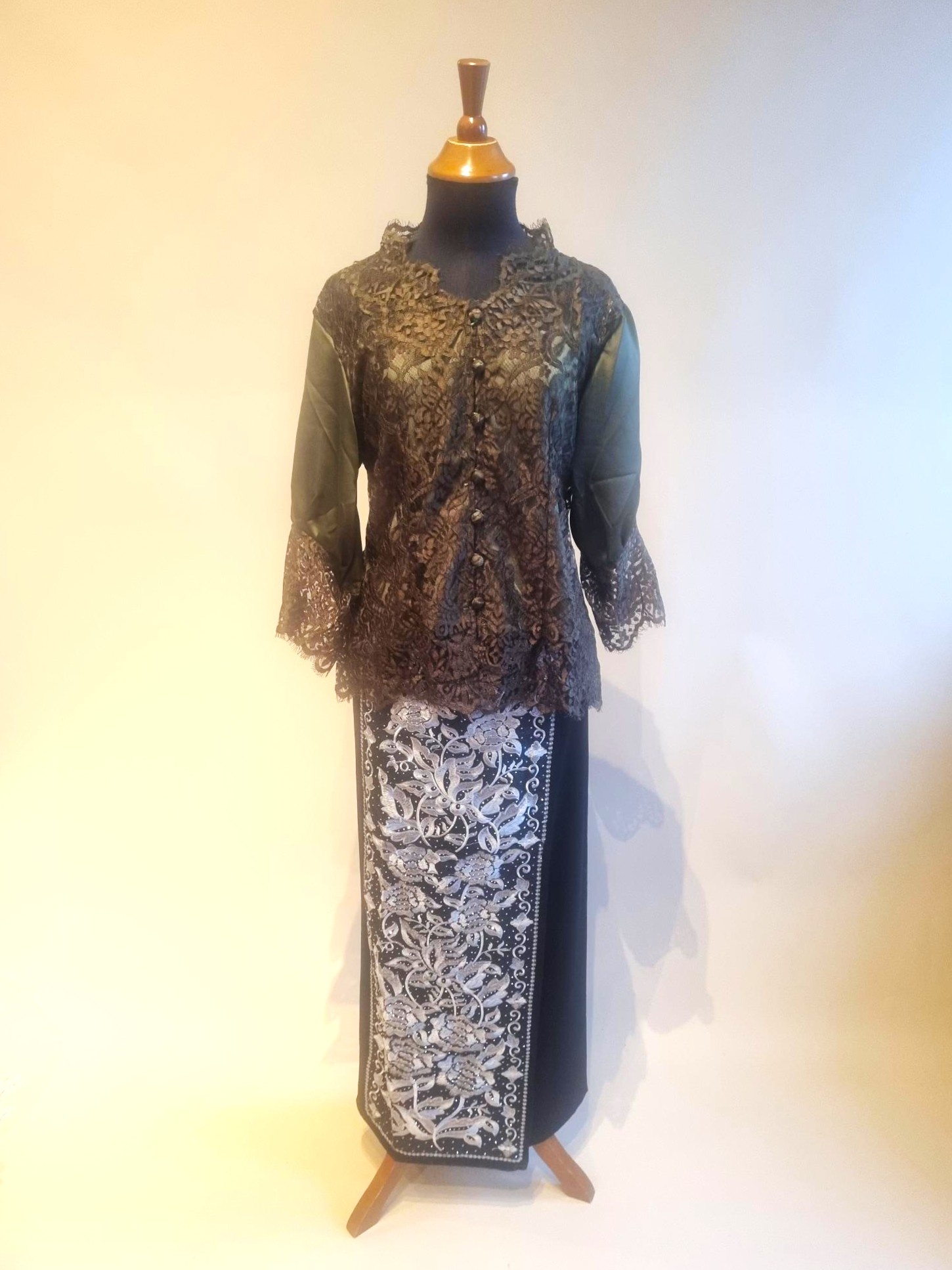 De kebaya is gemaakt van katoen i.c.m kantenstof, 3/4 mouw.