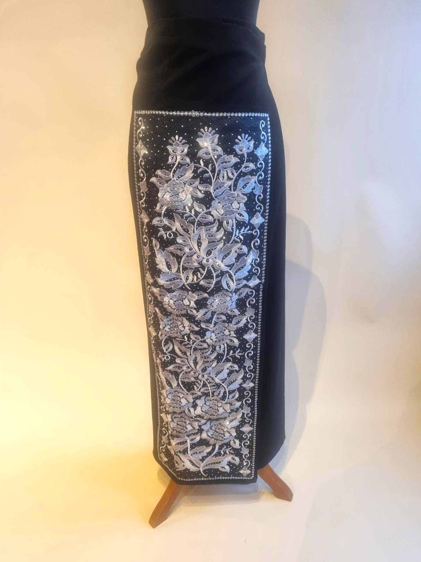De wikkel rok is gemaakt van polyester stof versierd met glitters.