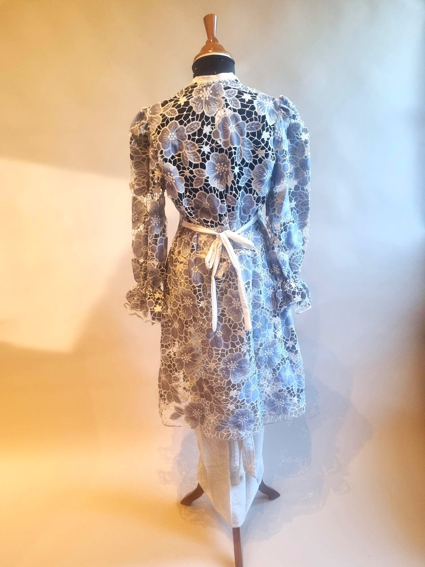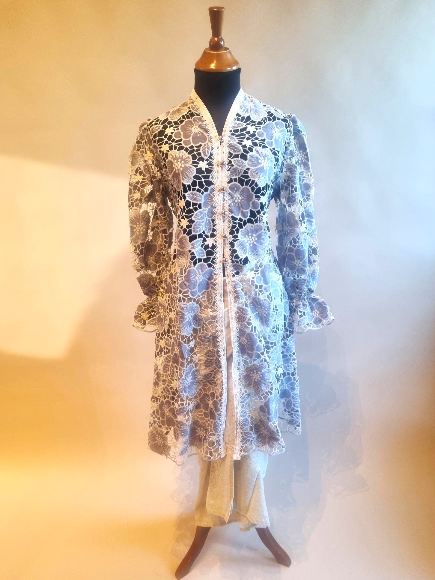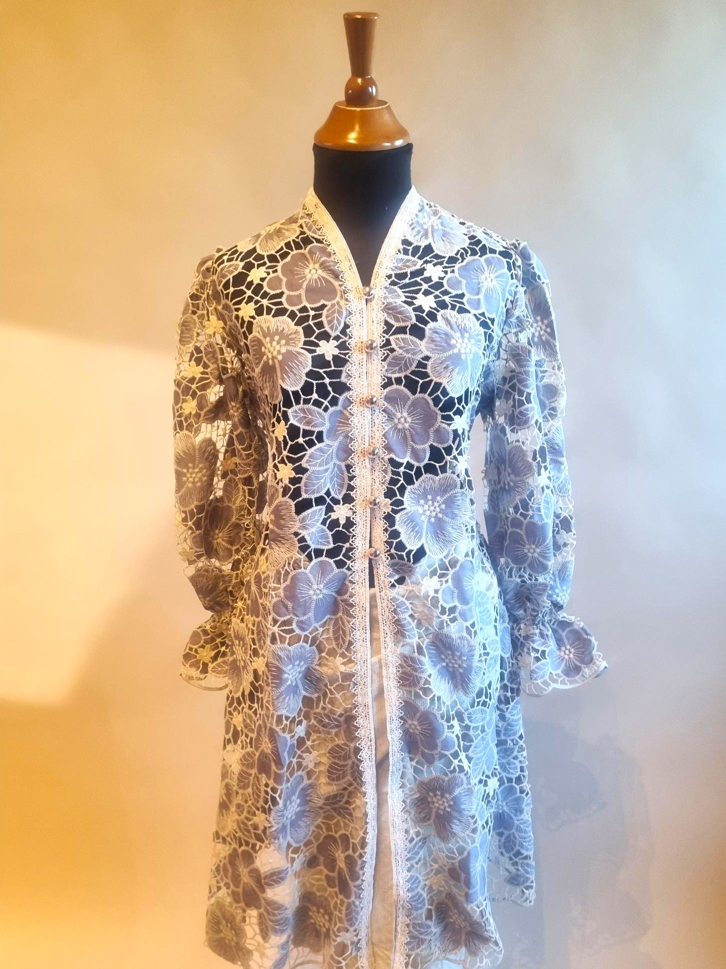 De kebaya is gemaakt van kanten stof, model met pofmouwen.