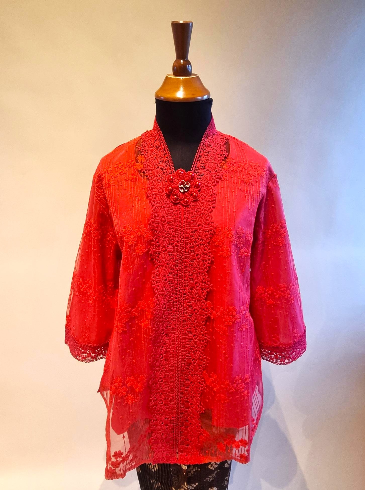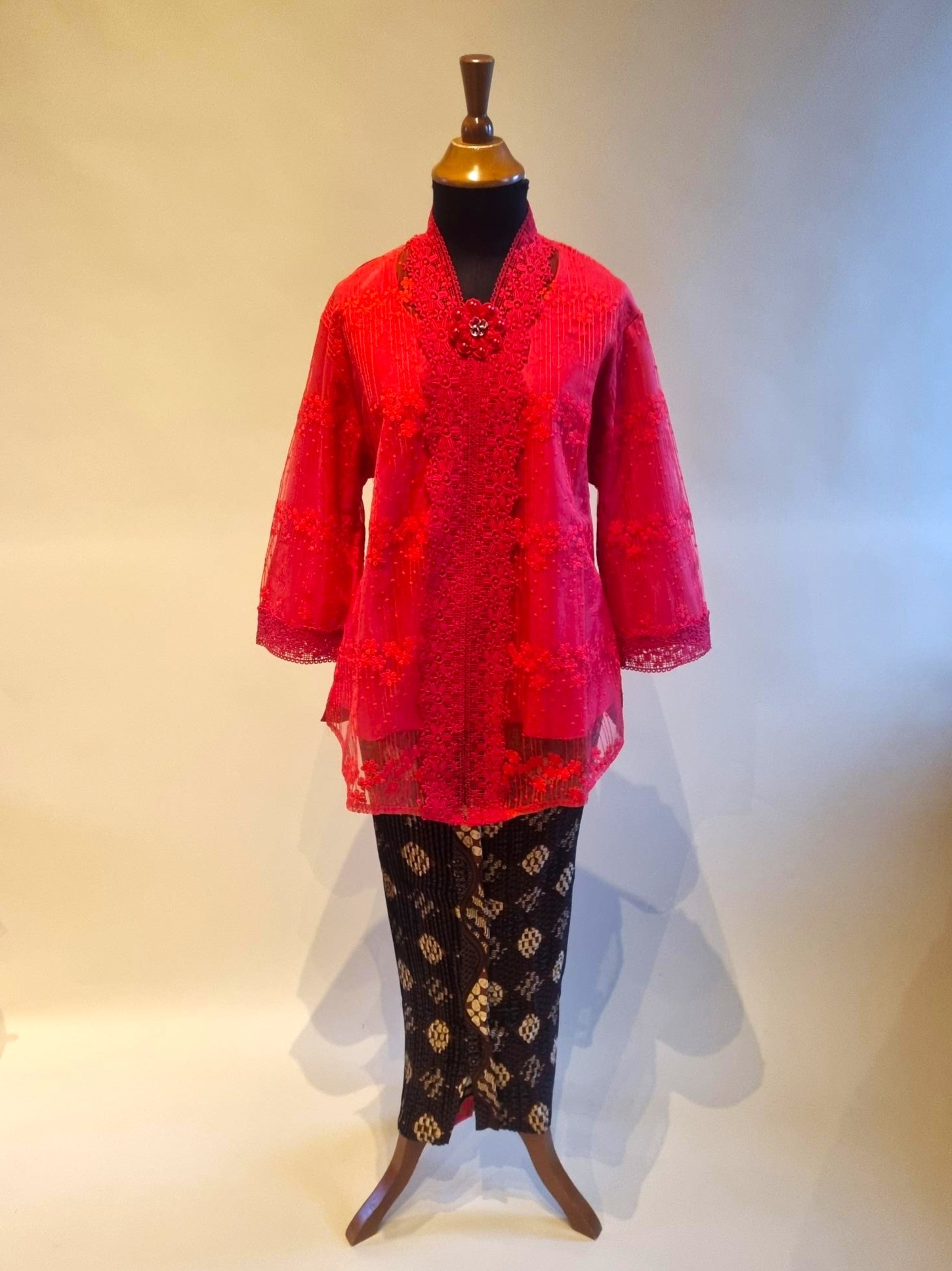 De kebaya is gemaakt van katoenstof i.c.m. polyester stof, versierd met een broche.