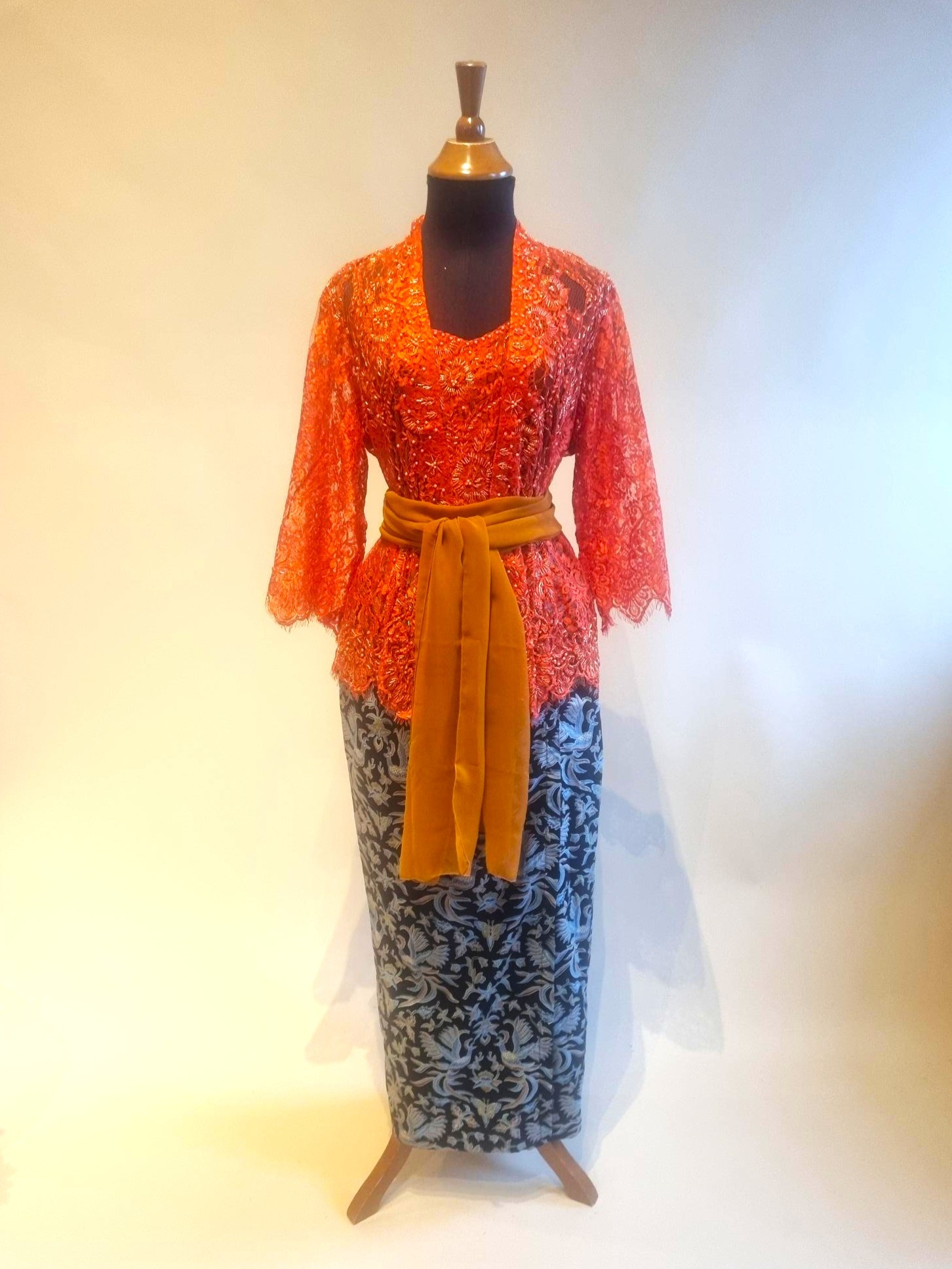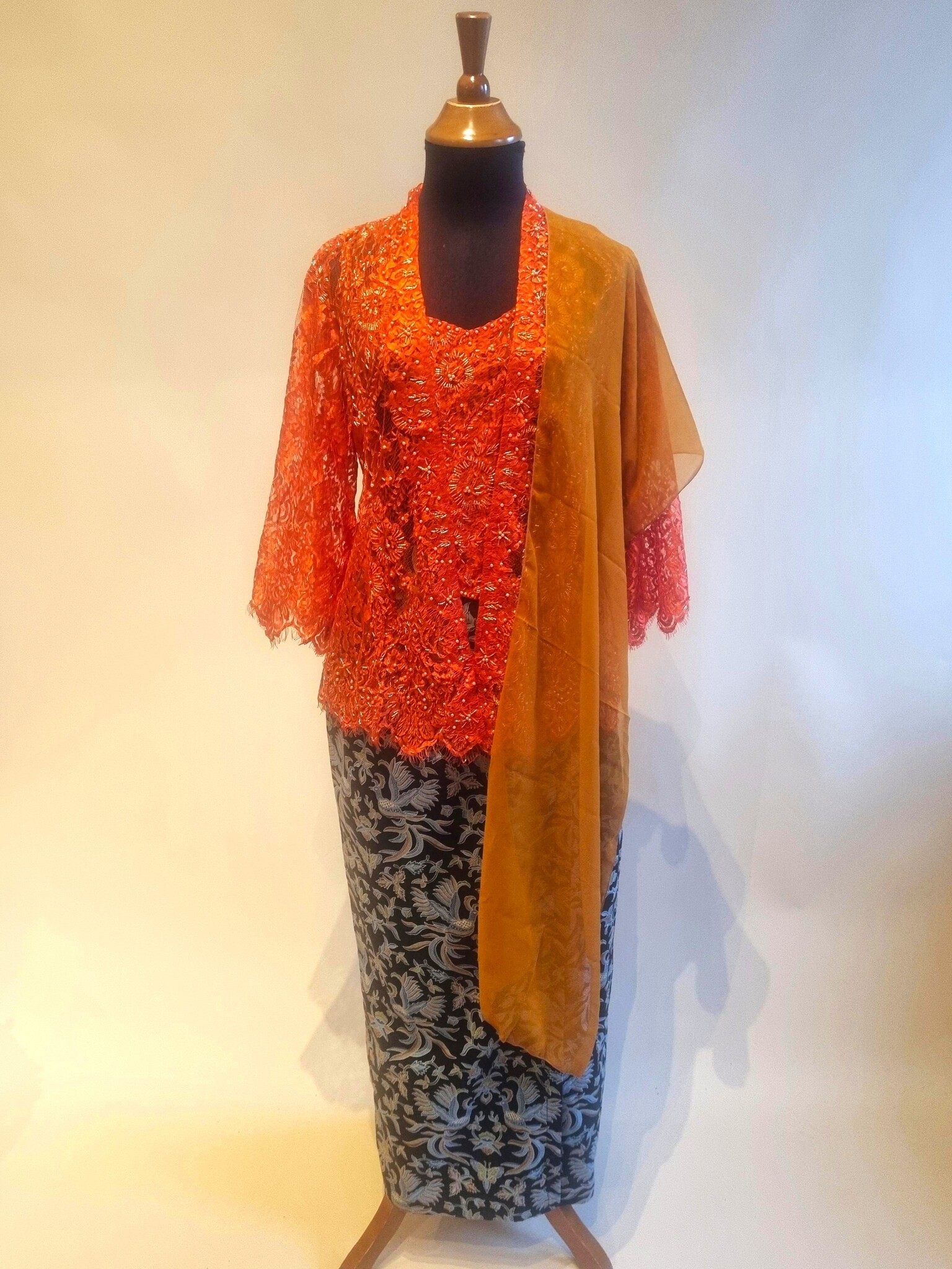 Kebaya oranje 3/4 mouw met bijpassende sarong en selendang