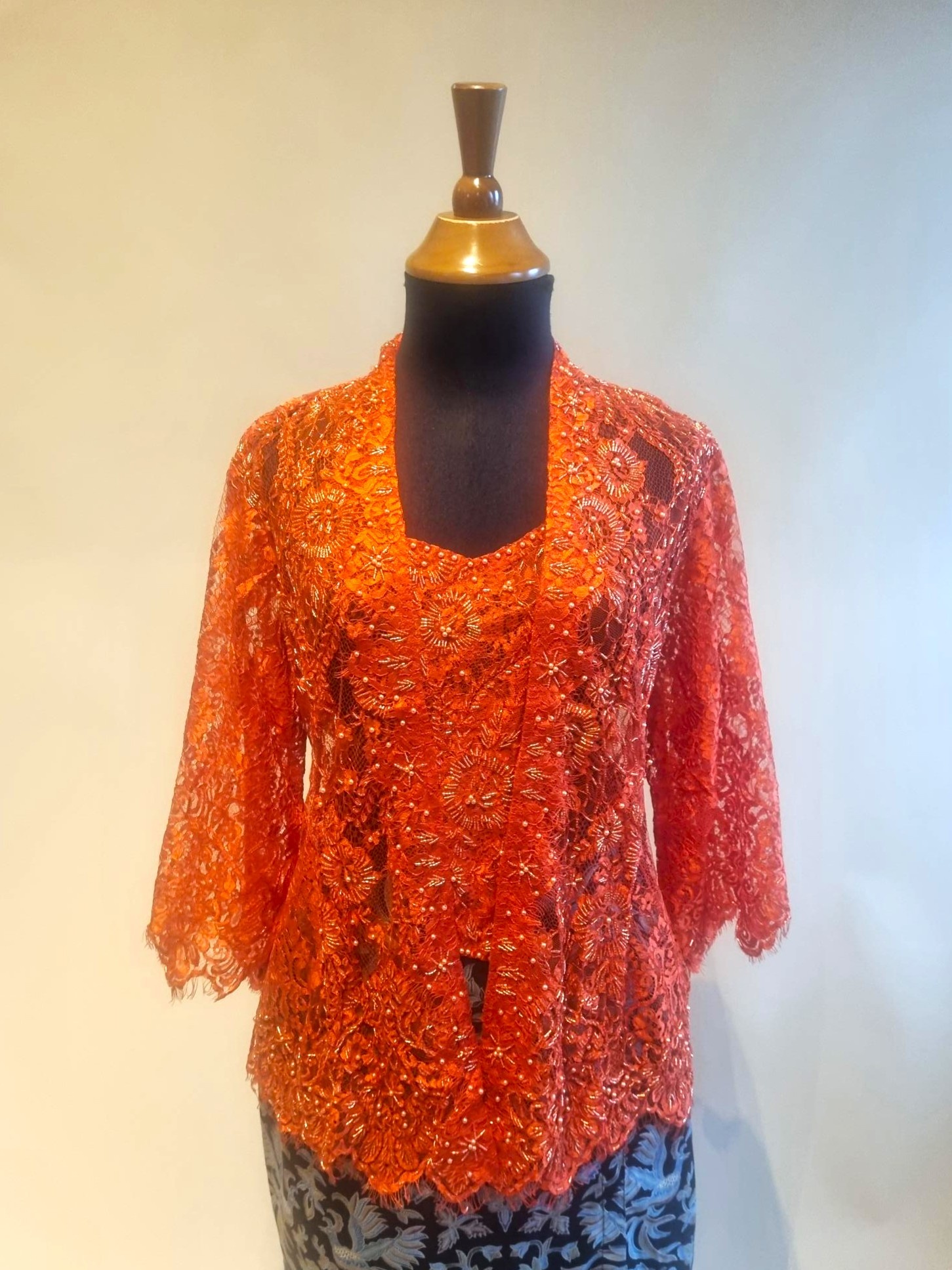 De kebaya is gemaakt van kanten stof, 3/4 mouw, versierd met pailletten.
