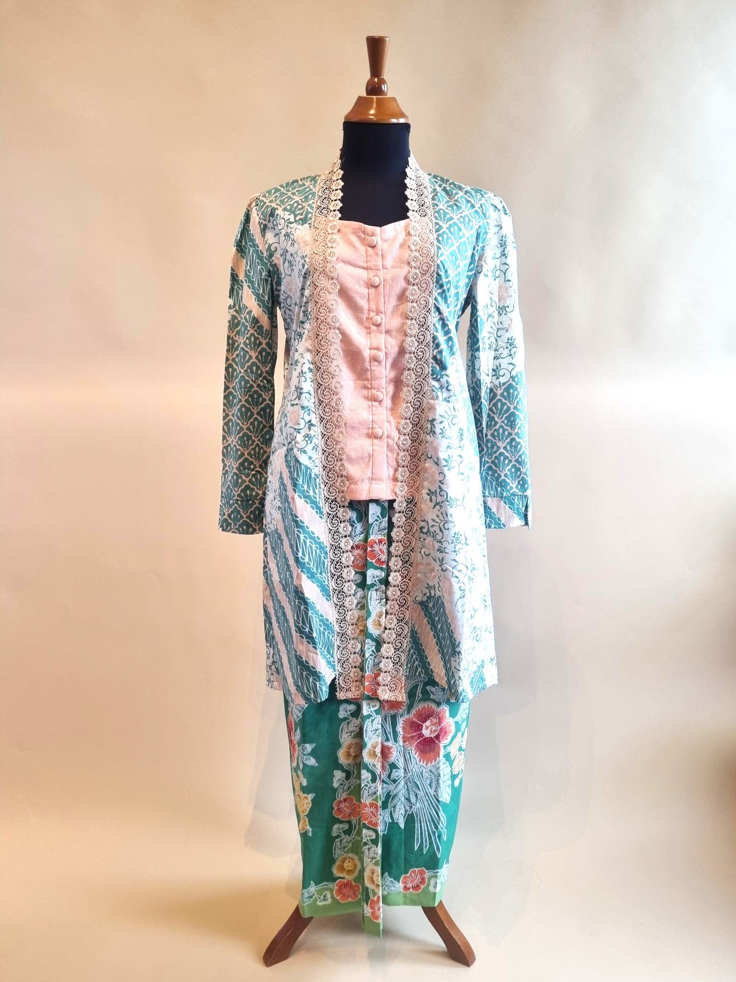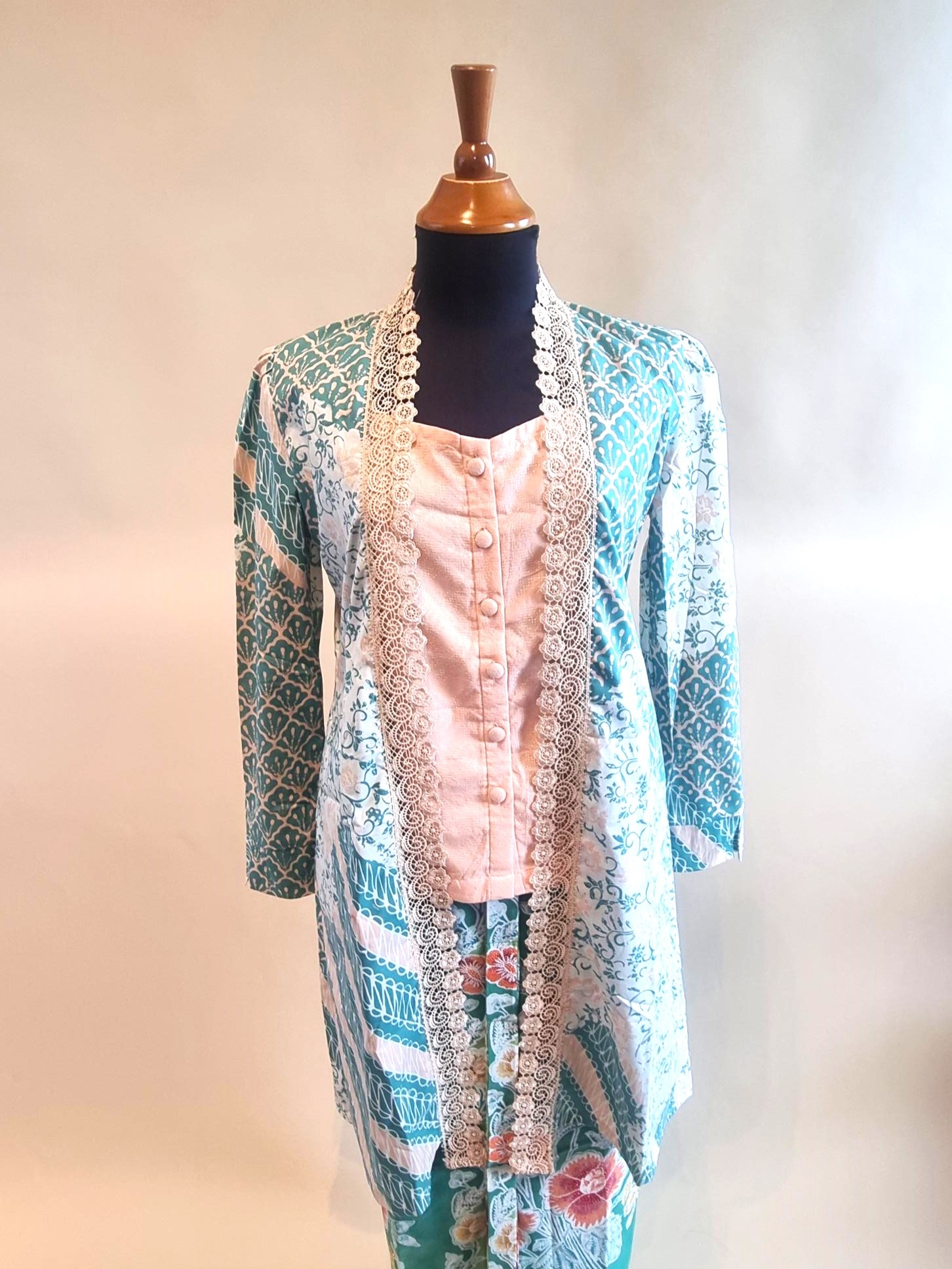 De kebaya is gemaakt van batik katoen stof.