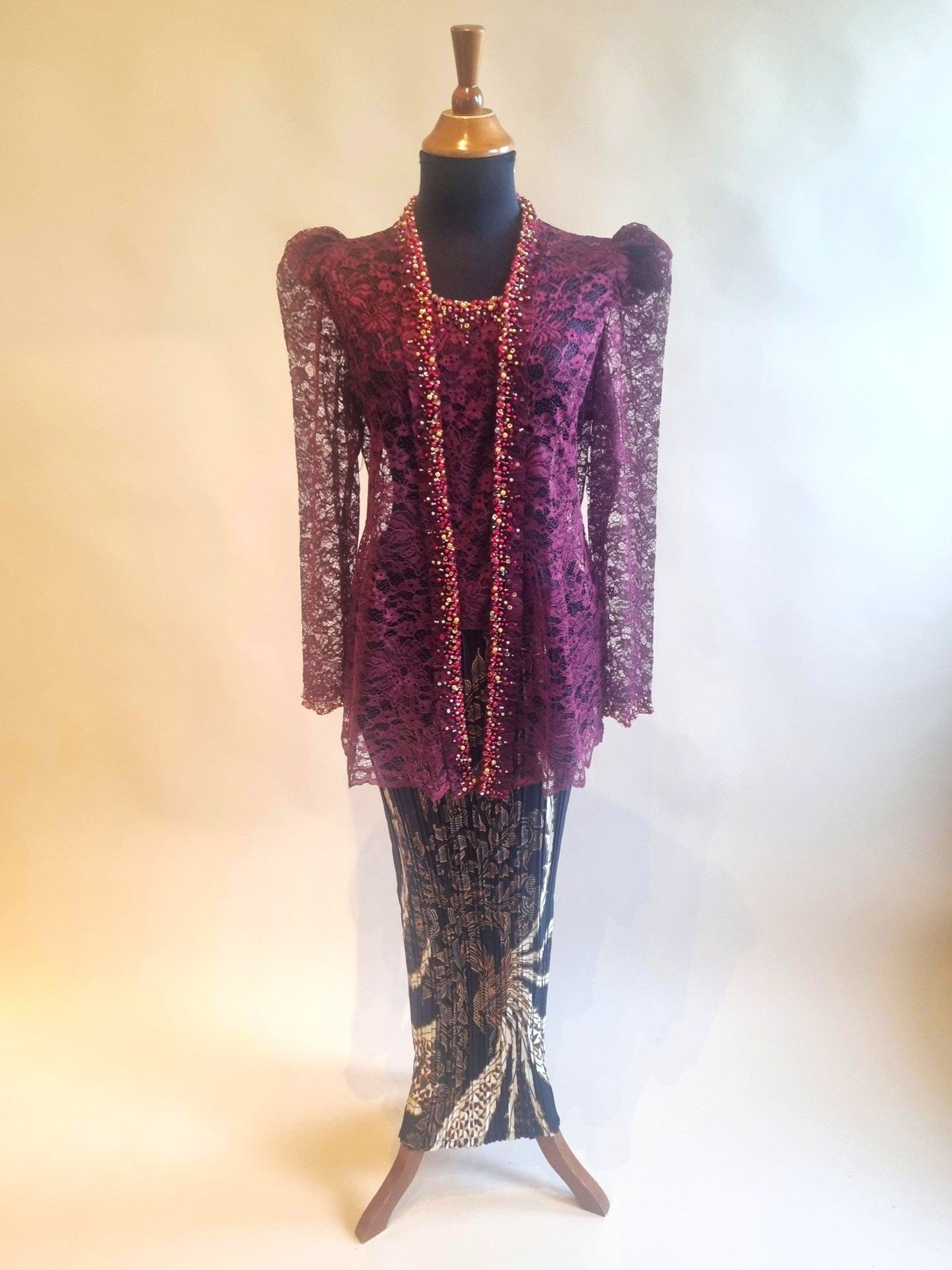 Kebaya trendy bordeaux met bijpassende rok plisse