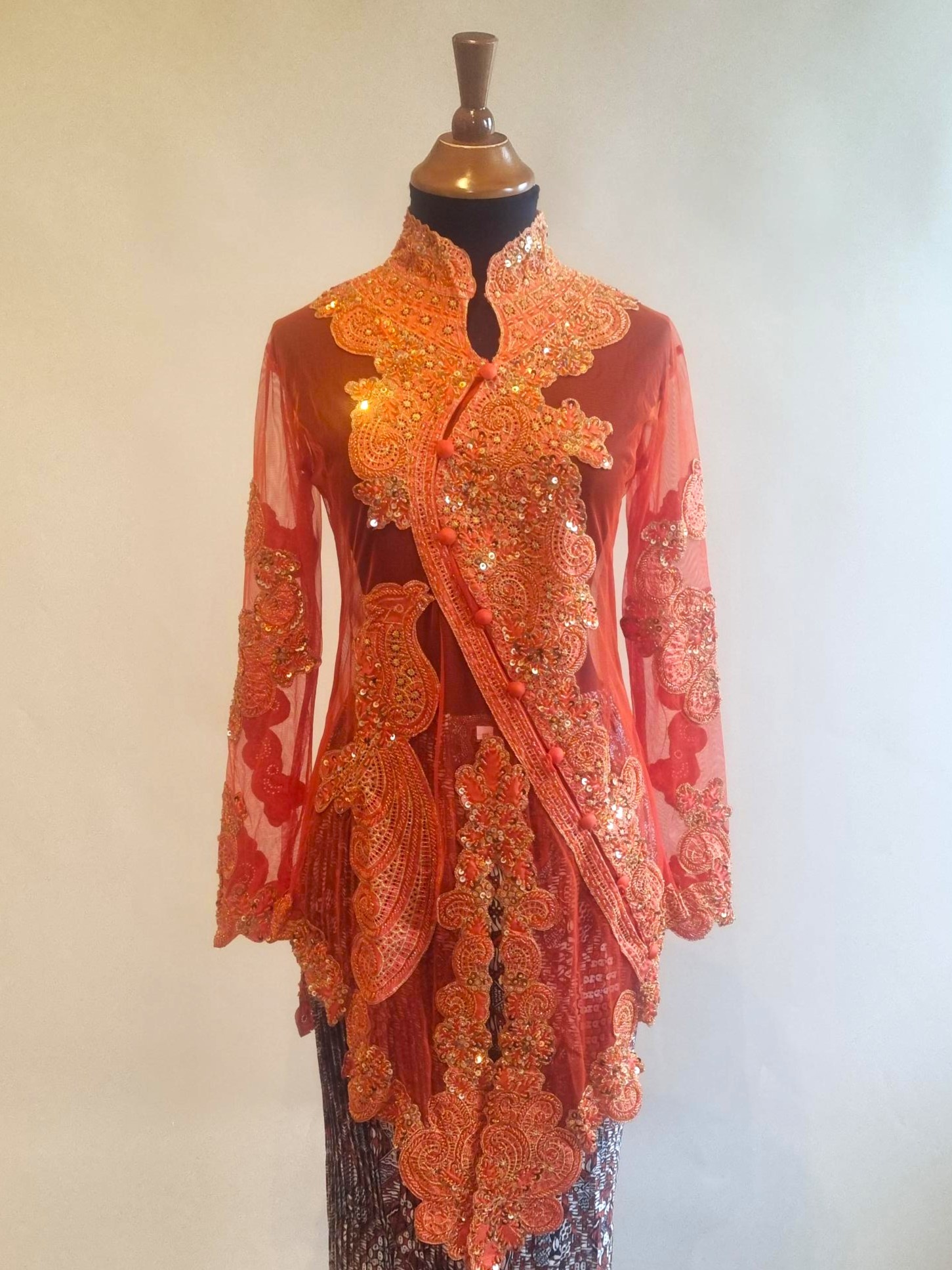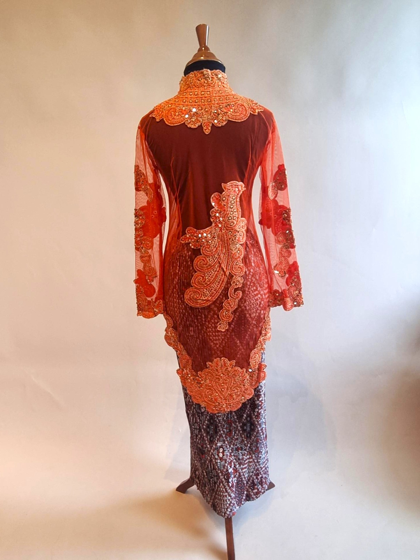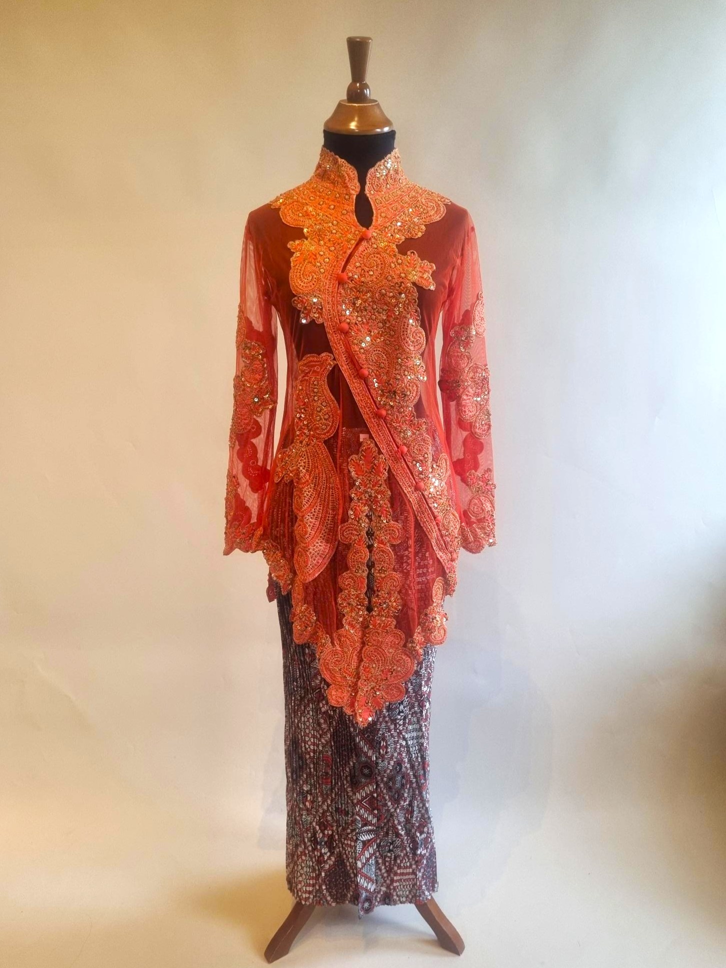 De kebaya is gemaakt van tulle rekbaar stof, versierd met pailletten.