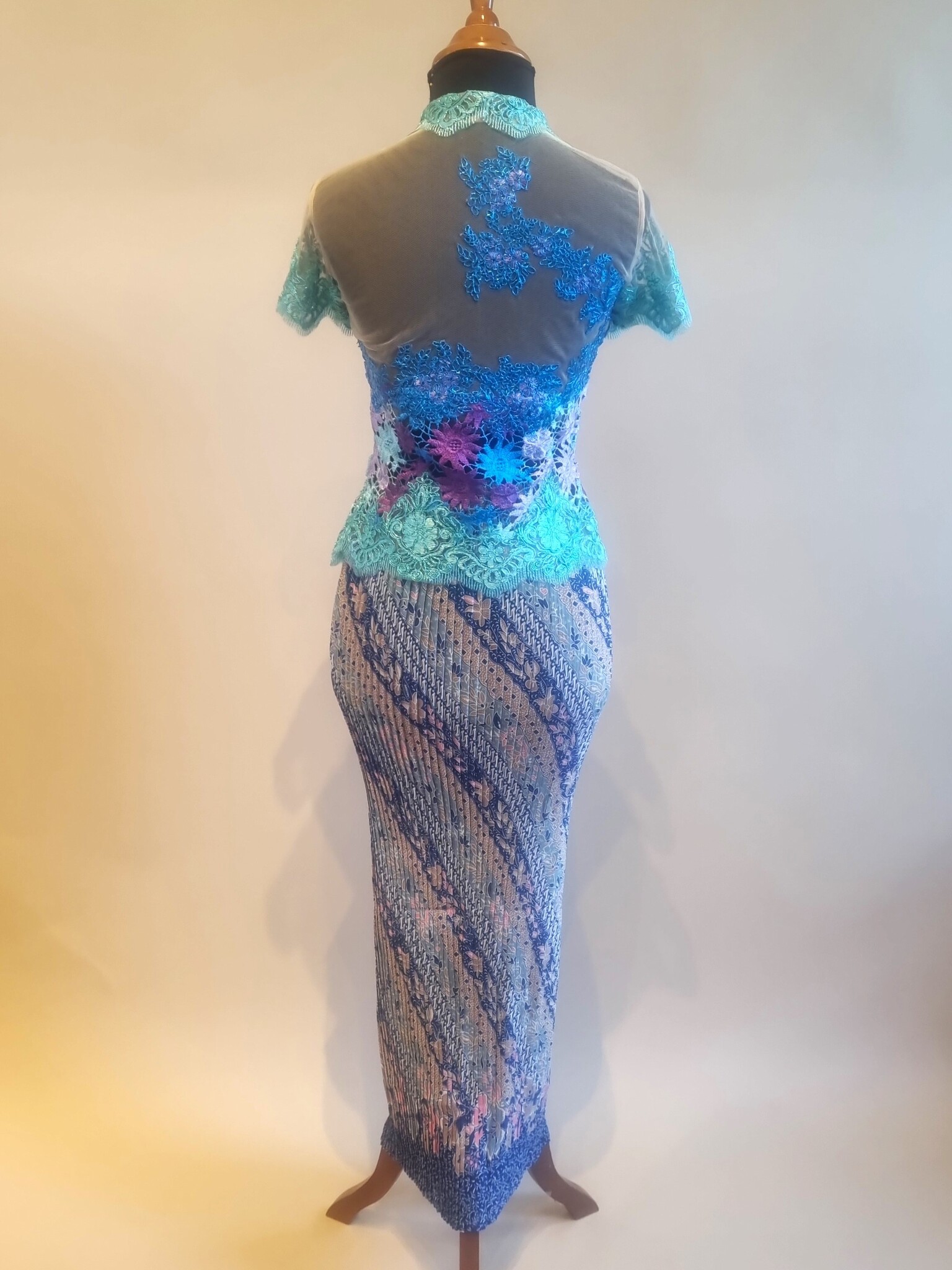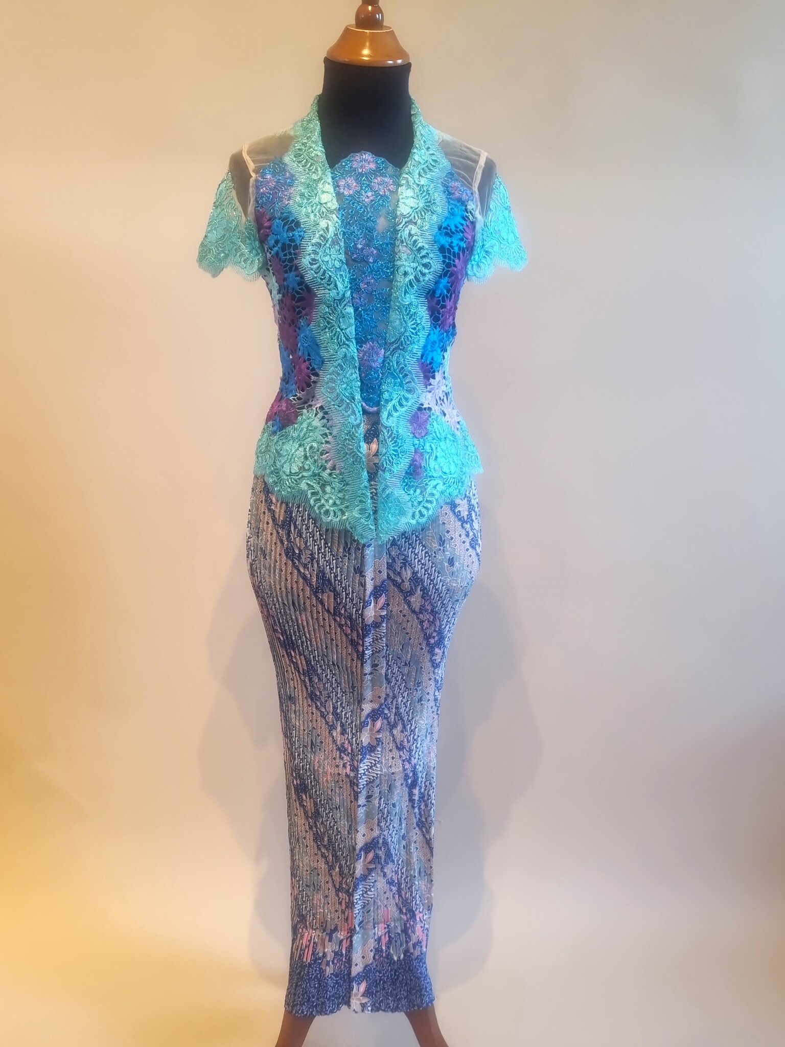 Kebaya turquoise korte mouw met bijpassende rok plissé