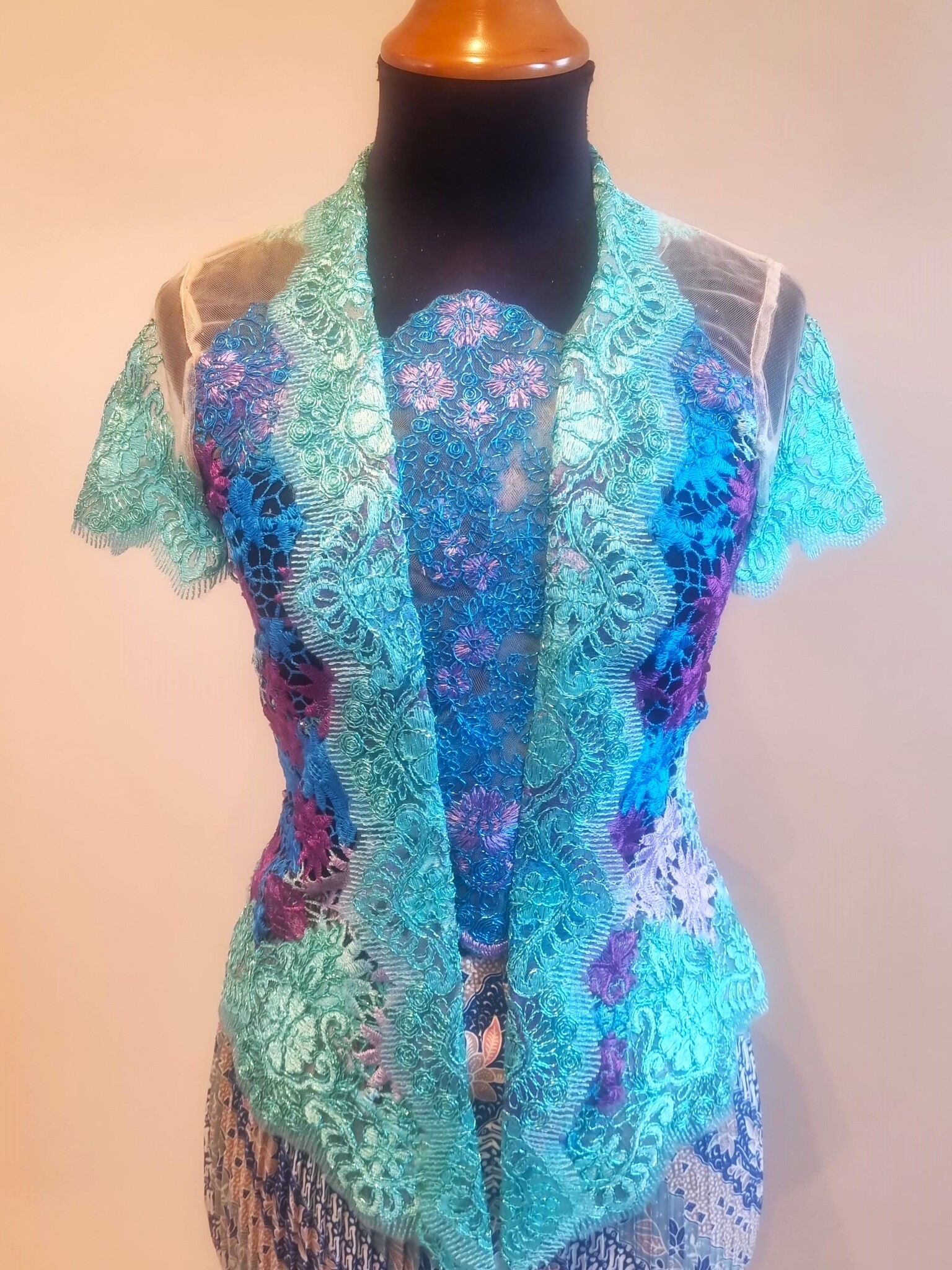 De kebaya is gemaakt van polyester i.c.m. tulle stof.