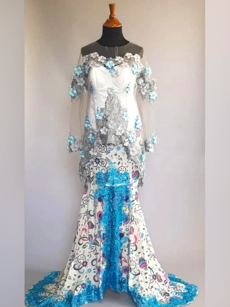 De bruidskebaya is gemaakt van kant (tulle) stof met bloemen applicatie.